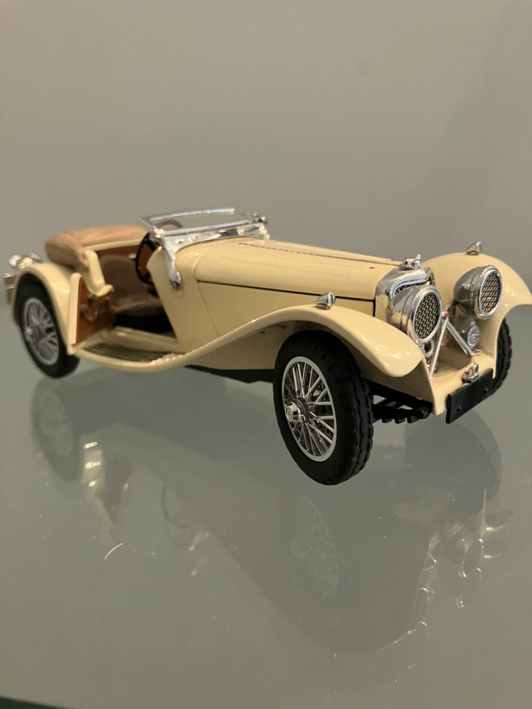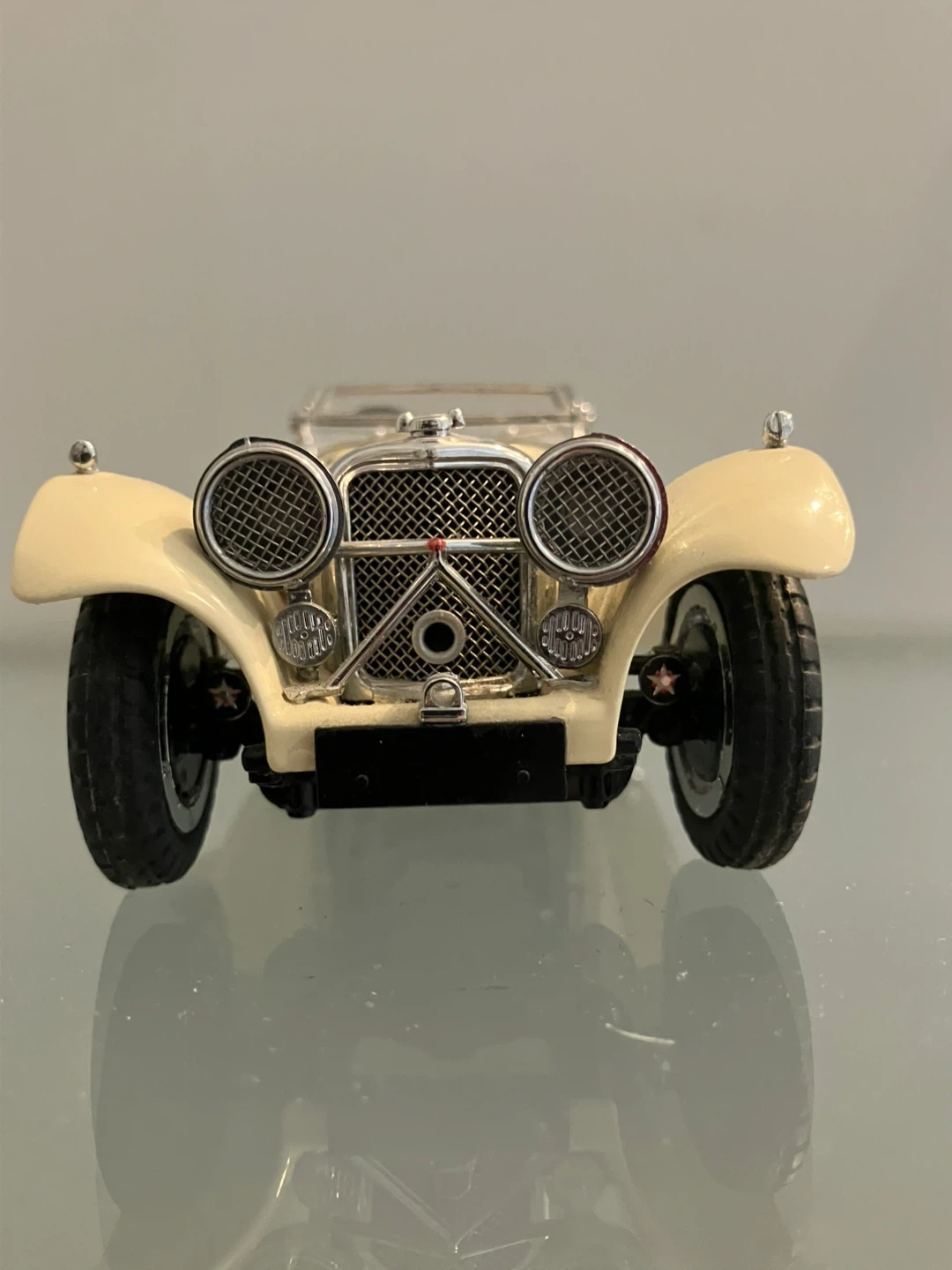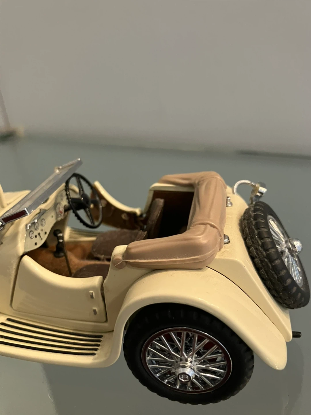 Selling a vintage cream-colored car model. It's a beautiful display piece with intricate details. The model features a classic open-top design with detailed wheels and a spare tire. It would make a great addition to any collection. From Franklin Mint 1988.