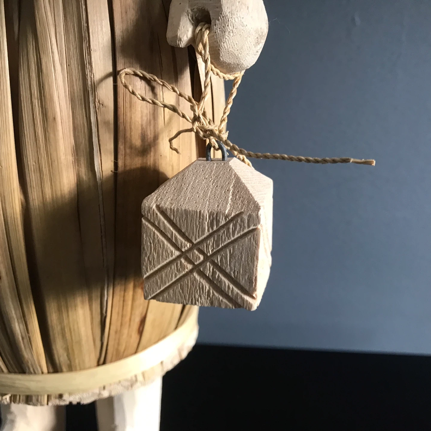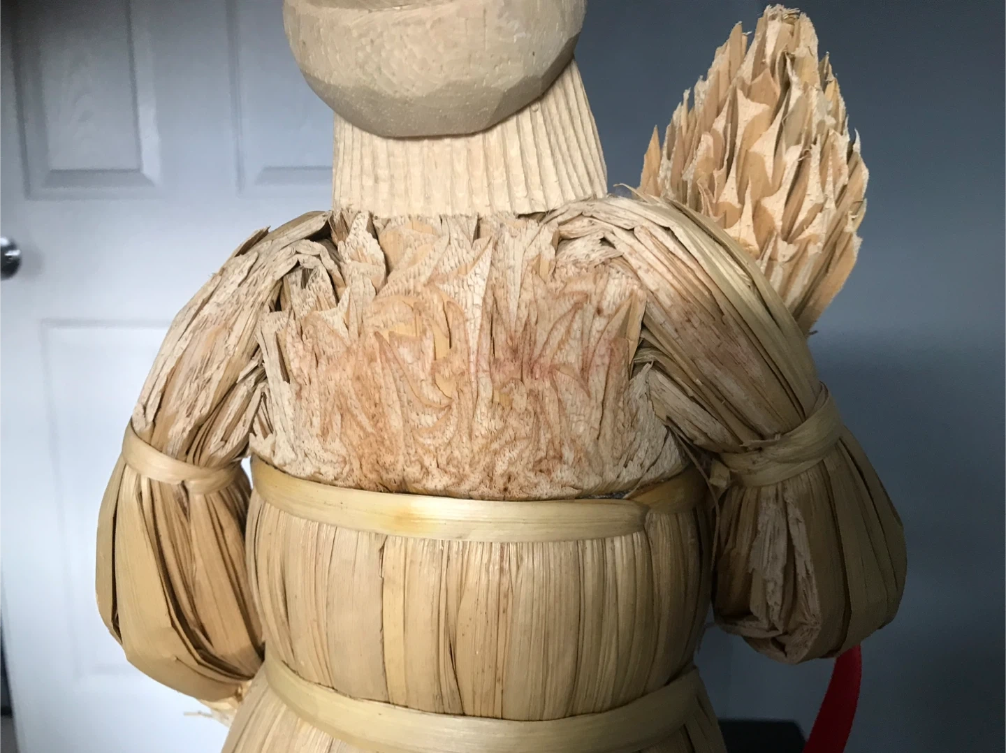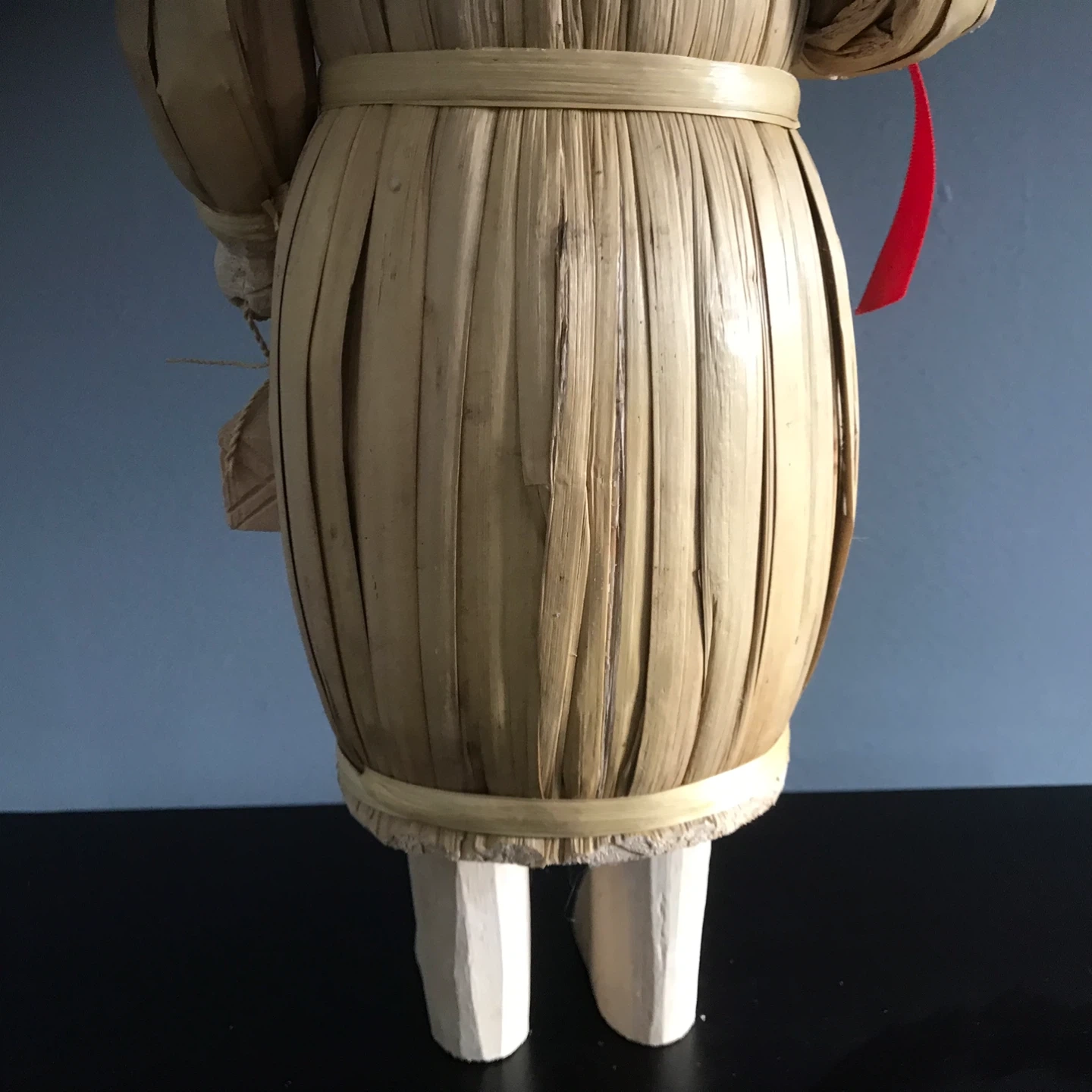 I'm selling a unique, handcrafted Santa figurine made of wood & corn husk. He's holding a bundle of straw in one hand and a small wooden house in the other. A red ribbon adds a festive touch. This charming piece would make a great addition to your holiday decor!