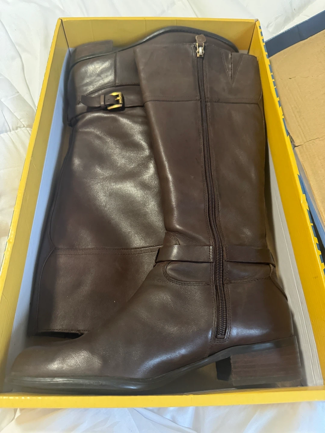 These are a pair of Cole Haan brown leather riding boots in a size 8.5. They are in great condition and come with the original box. These boots feature a zipper closure and a stylish buckle detail. Perfect for adding a touch of elegance to any outfit!