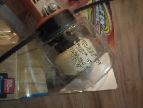 Hi! Well, this is a thrift store find and the box/package is a bit beat up, but the toy itself looks brand new. I'm not 100% sure what this actually does. I think you pull the "rip-cord" and watch the wheel take off across the room or down the street. In any case, I hope someone out there needs or wants this in their life. Thanks for looking.