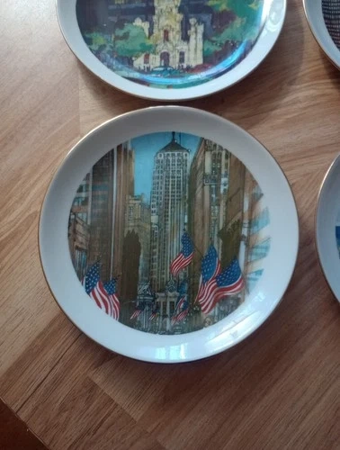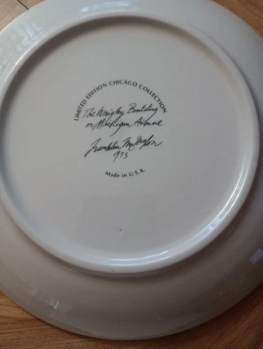 Enjoy this quartet of vintage collector plates featuring colorful Chicago landmarks rendered by Franklin McMahon, an acclaimed American illustrator and "reportorial artist" who brought his gift for drawing to cover some of the most important political developments of his day. These plates, which as a full set were issued in pairs between 1972 and 1981, were crafted by Homer Laughlin, and featured as a two-a-year premium to customers of the Continental Bank in Chicago.