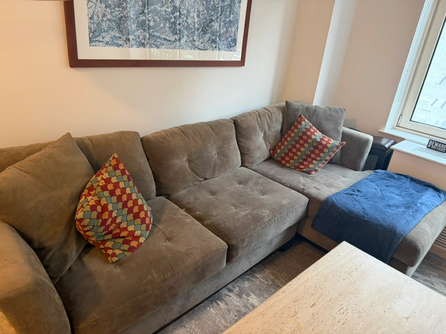 Selling a comfy sectional sofa in brown! It's perfect for lounging and relaxing. It has some decorative pillows. It's in good condition and ready for a new home
