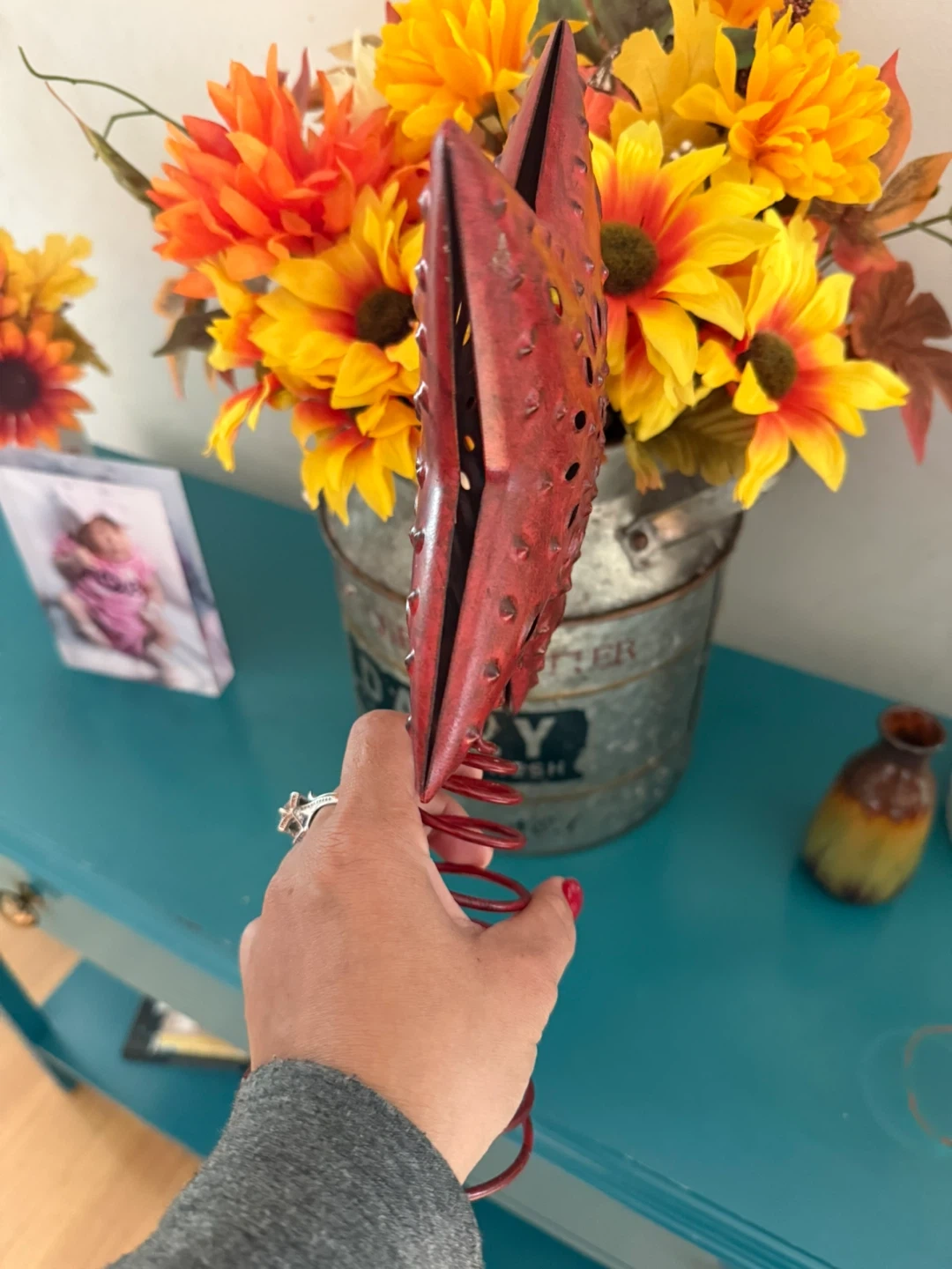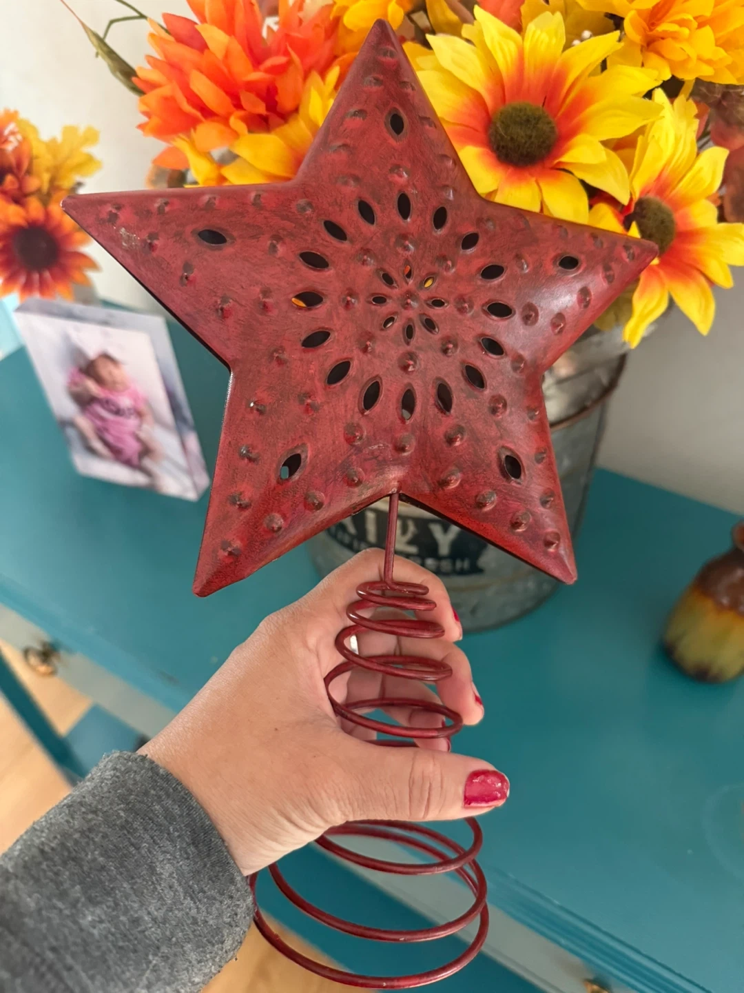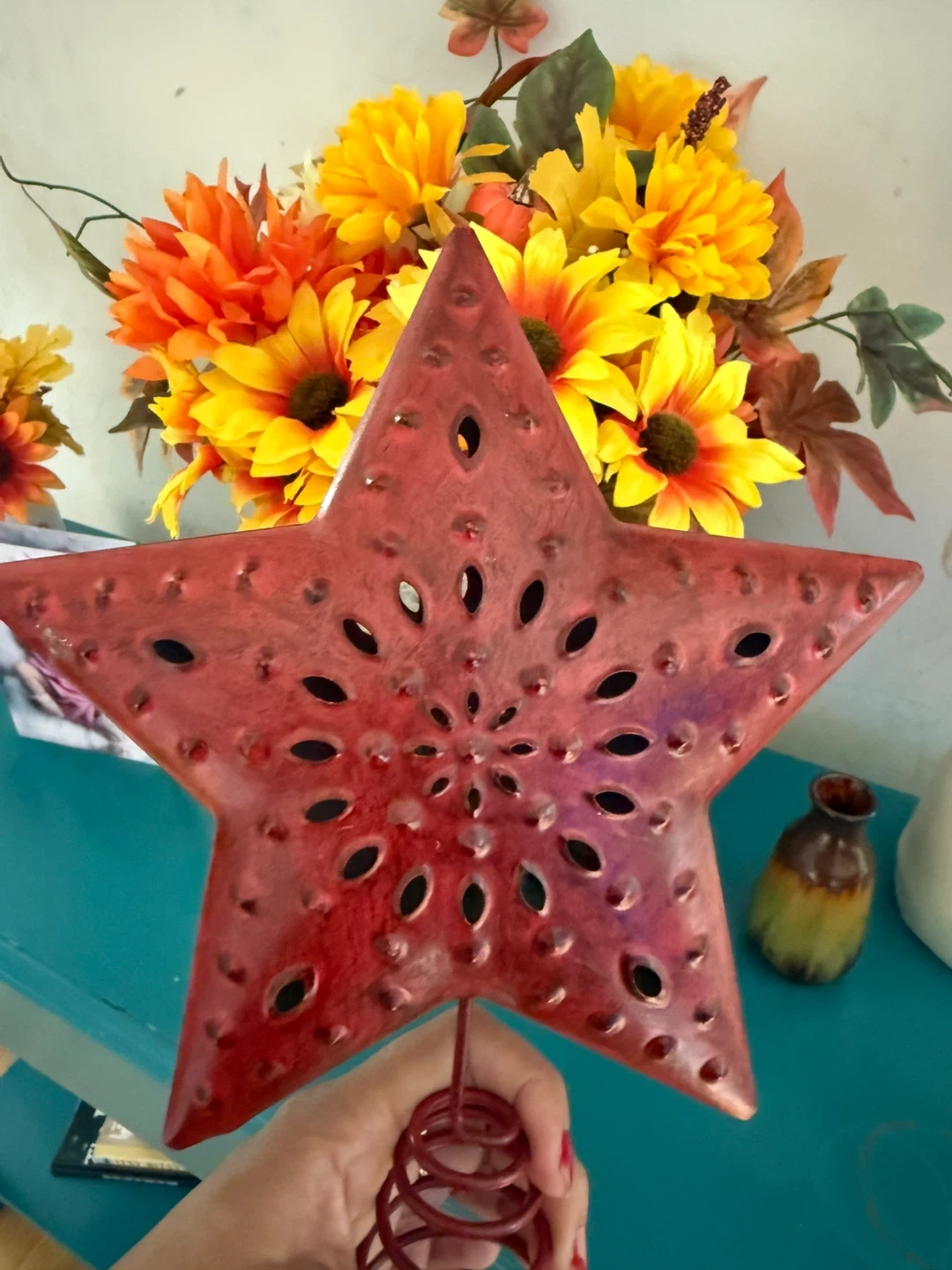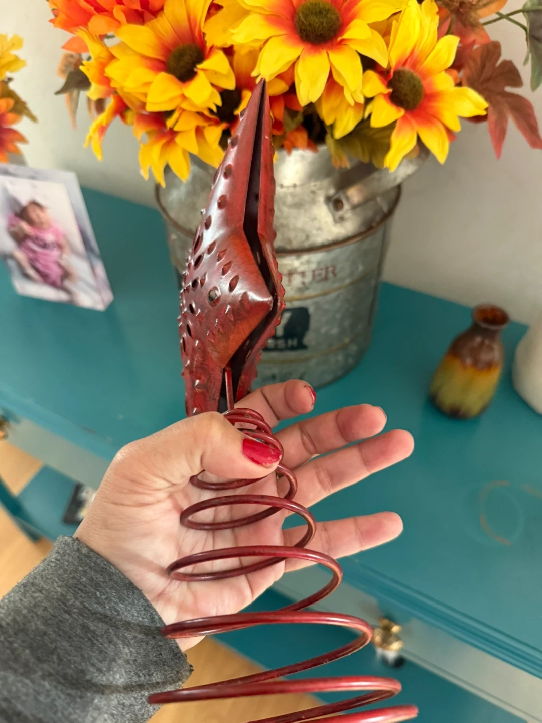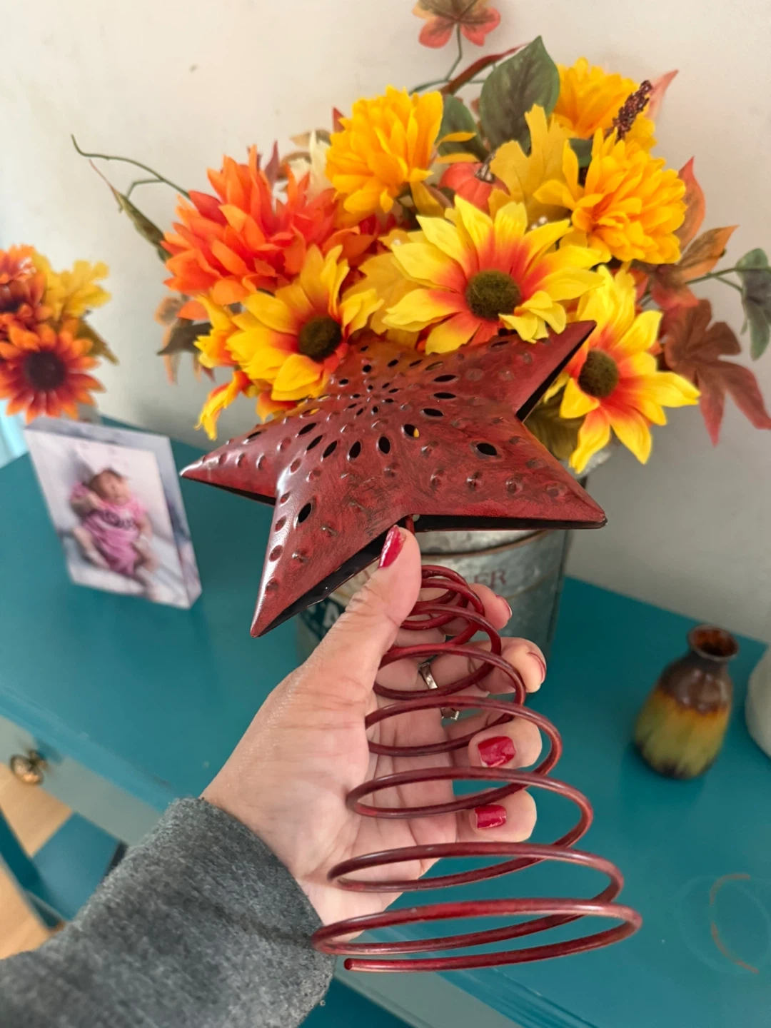 Add a festive touch to your Christmas tree with this charming red star tree topper! It features a unique design with decorative perforations and a sturdy spring base for easy attachment. Perfect for completing your holiday decor
