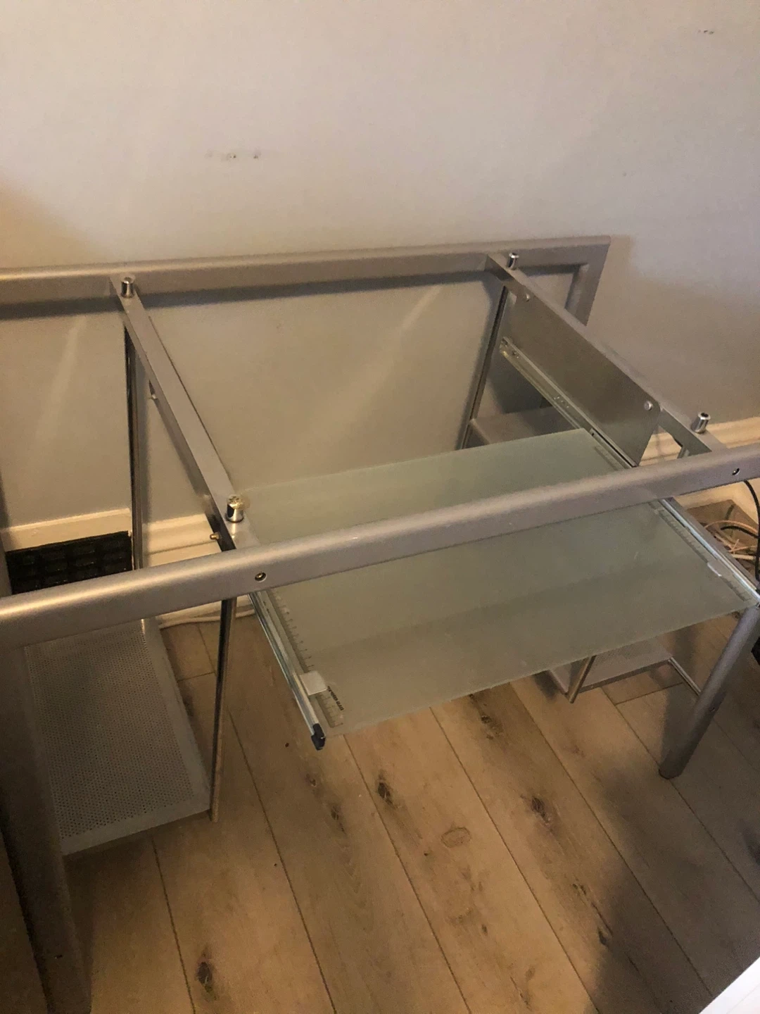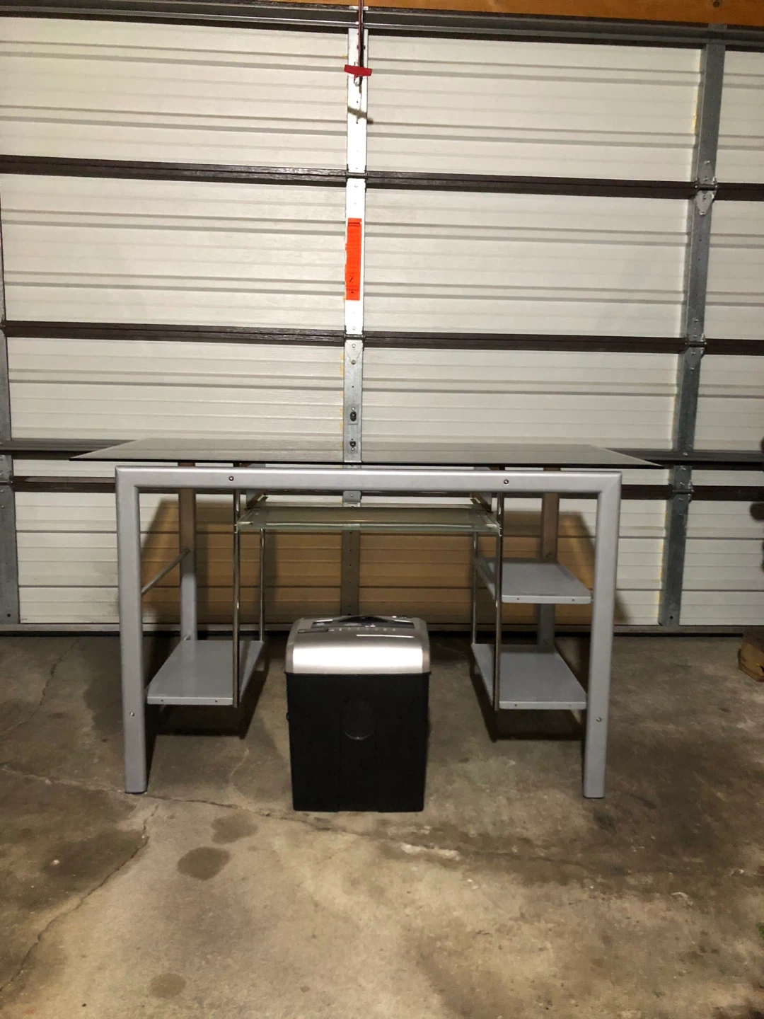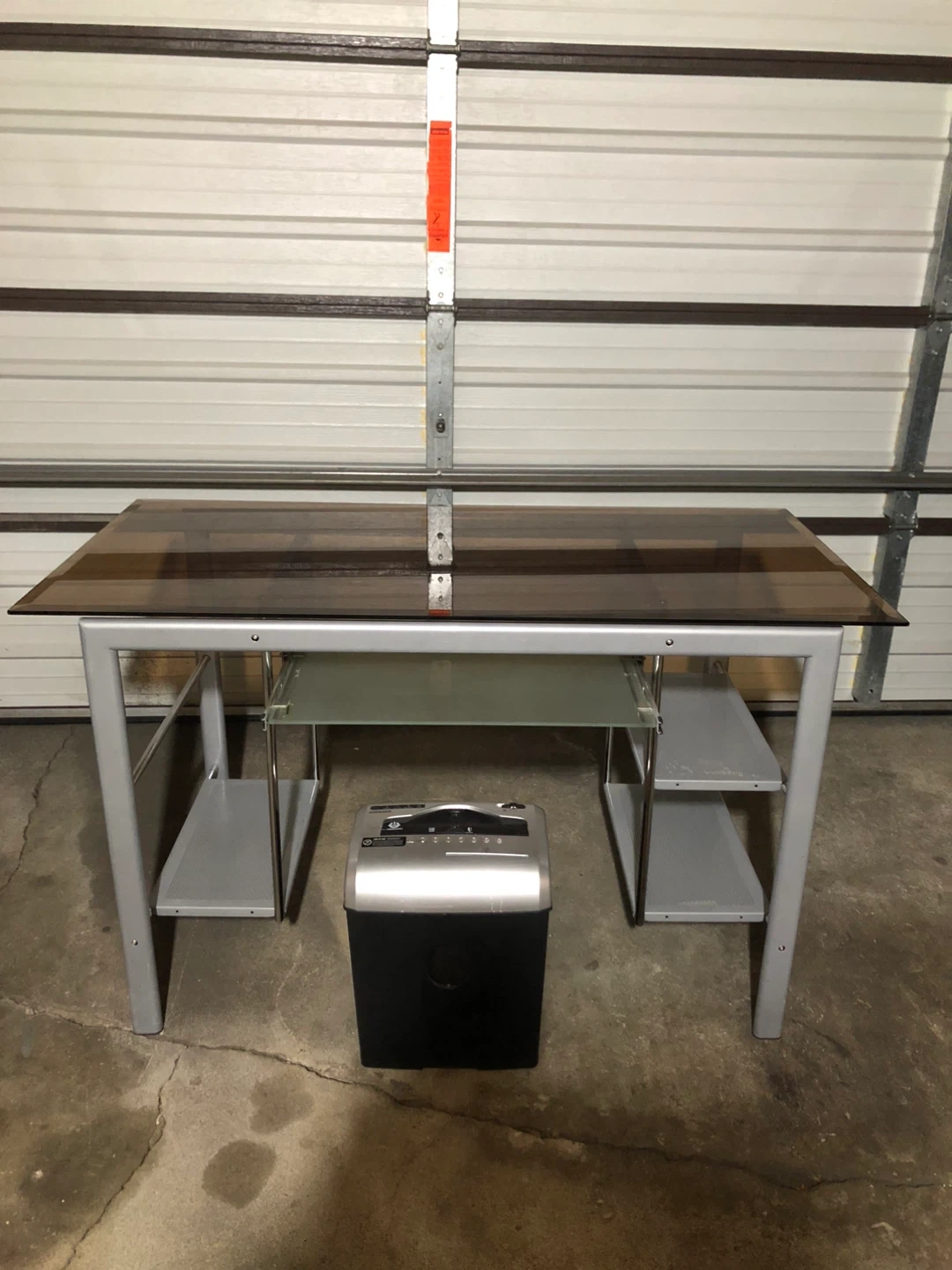 Selling a glass top computer desk in good condition. It features a sleek design with a glass top and a metal frame. There are shelves on the sides for storage and a sliding keyboard tray. Perfect for a home office or study space!