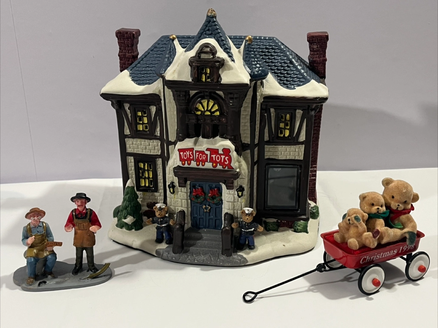 I'm selling a charming Vintage Victorian 2010 "Toys For Tots" Christmas Village. It comes with the building, a wagon with teddy bears marked Christmas 1998, and two figurine sets. They are in good condition and would be a lovely addition to your holiday decorations!
