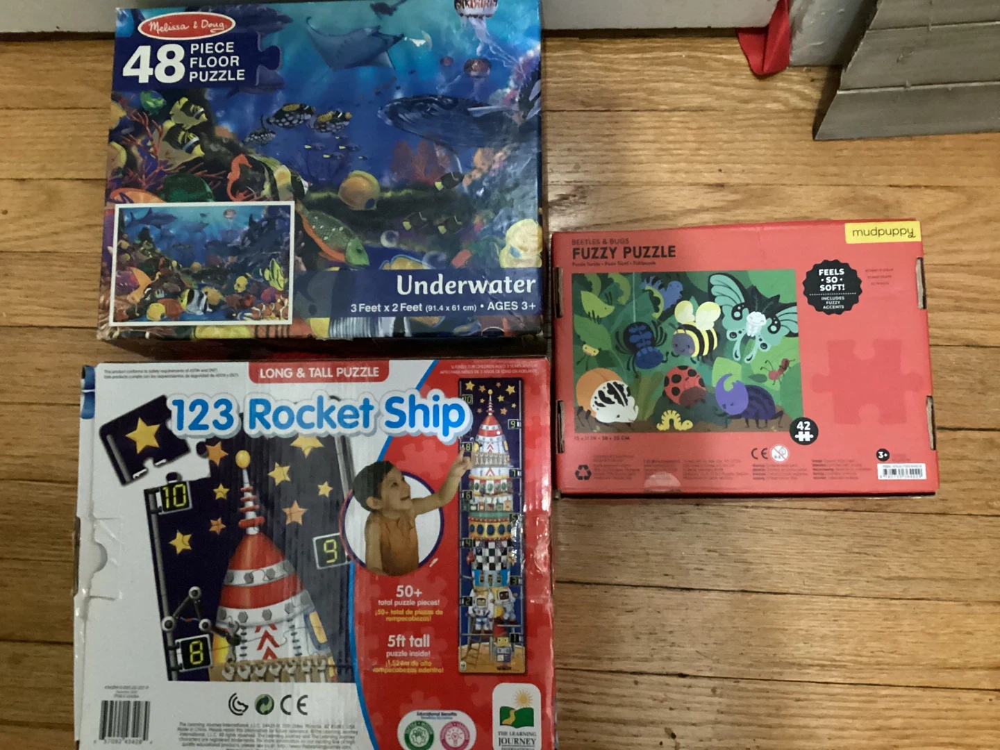 Selling a few fun puzzles! There's a Melissa & Doug 48-piece floor puzzle with an underwater theme. Also included is a Mudpuppy Fuzzy Puzzle with beetles and bugs, and a Learning Journey 123 Rocket Ship puzzle. Great for ages 3+!