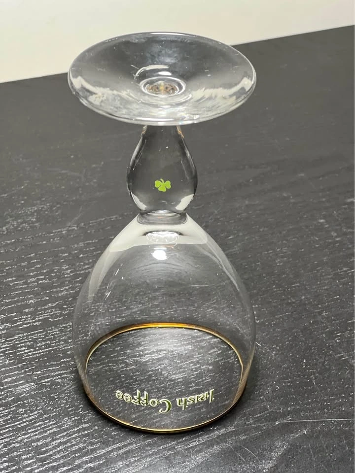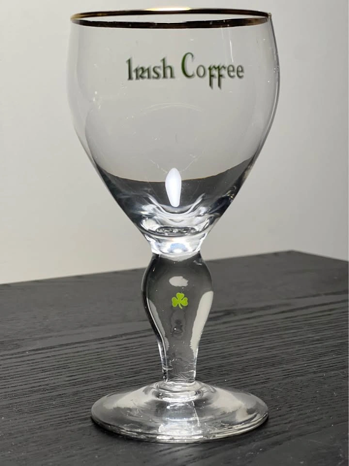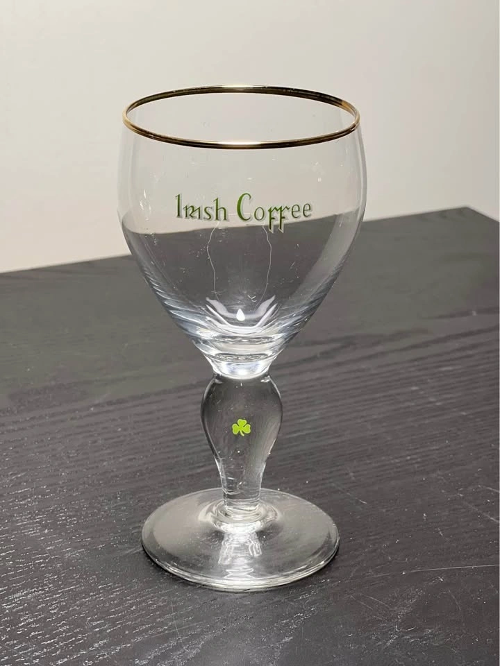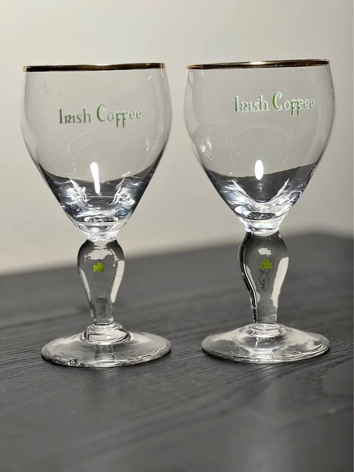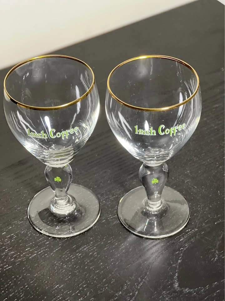 Add a touch of Irish charm to your barware collection with this elegant set of two vintage Irish Coffee glasses. Featuring a slender stem with a green shamrock detail and a delicate gold rim, these glasses evoke classic mid-century style and are perfect for cozy evenings or festive gatherings.