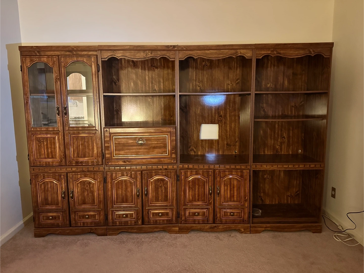 Selling a large wooden entertainment center. It features glass door cabinets, shelving, and lower cabinets for ample storage. It's a great piece for organizing your living room or entertainment space
