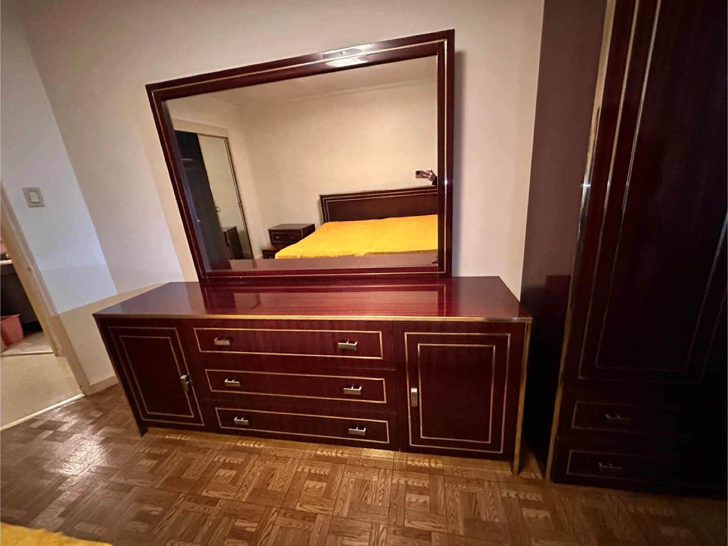 Selling a complete vintage bedroom set. Includes bed frame, a dresser with a mirror, a nightstand, and a wardrobe. The set features a rich, dark wood finish with gold trim. Perfect for adding a touch of classic elegance to your bedroom!