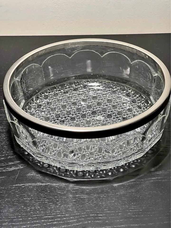 Material: The bowl itself is made of clear, heavy glass or cut lead crystal. The rim is silver-plated.