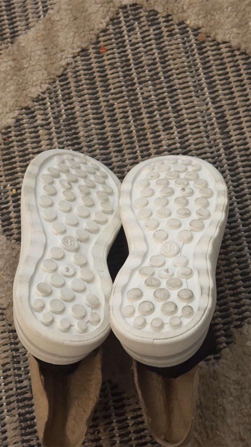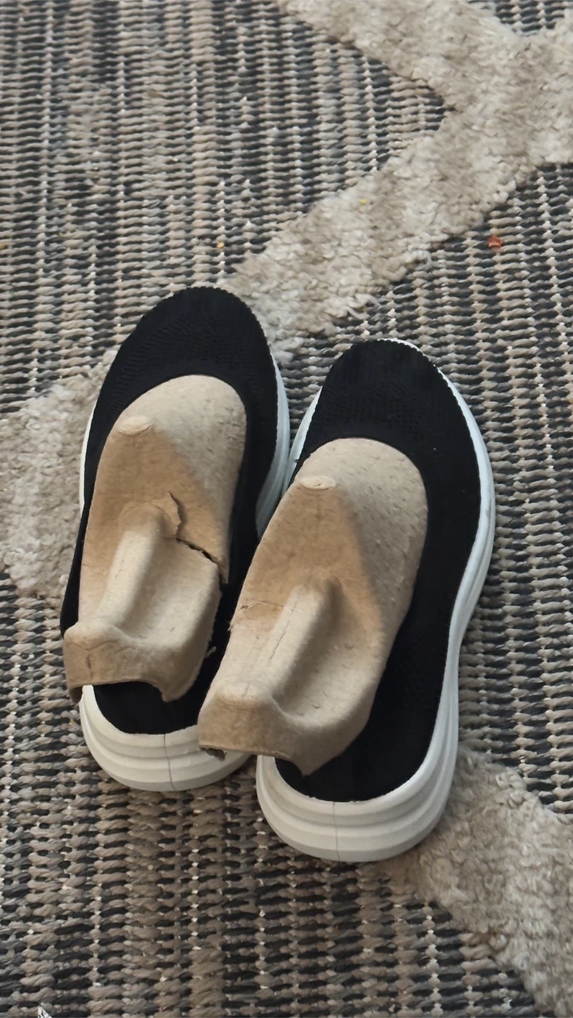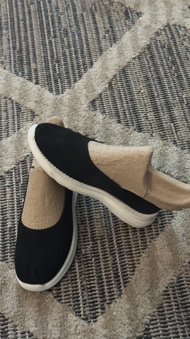 Selling a pair of comfortable black knit slip-on sneakers. The size is 39 (European). They have a white sole and appear to be in good condition! Perfect for casual wear.