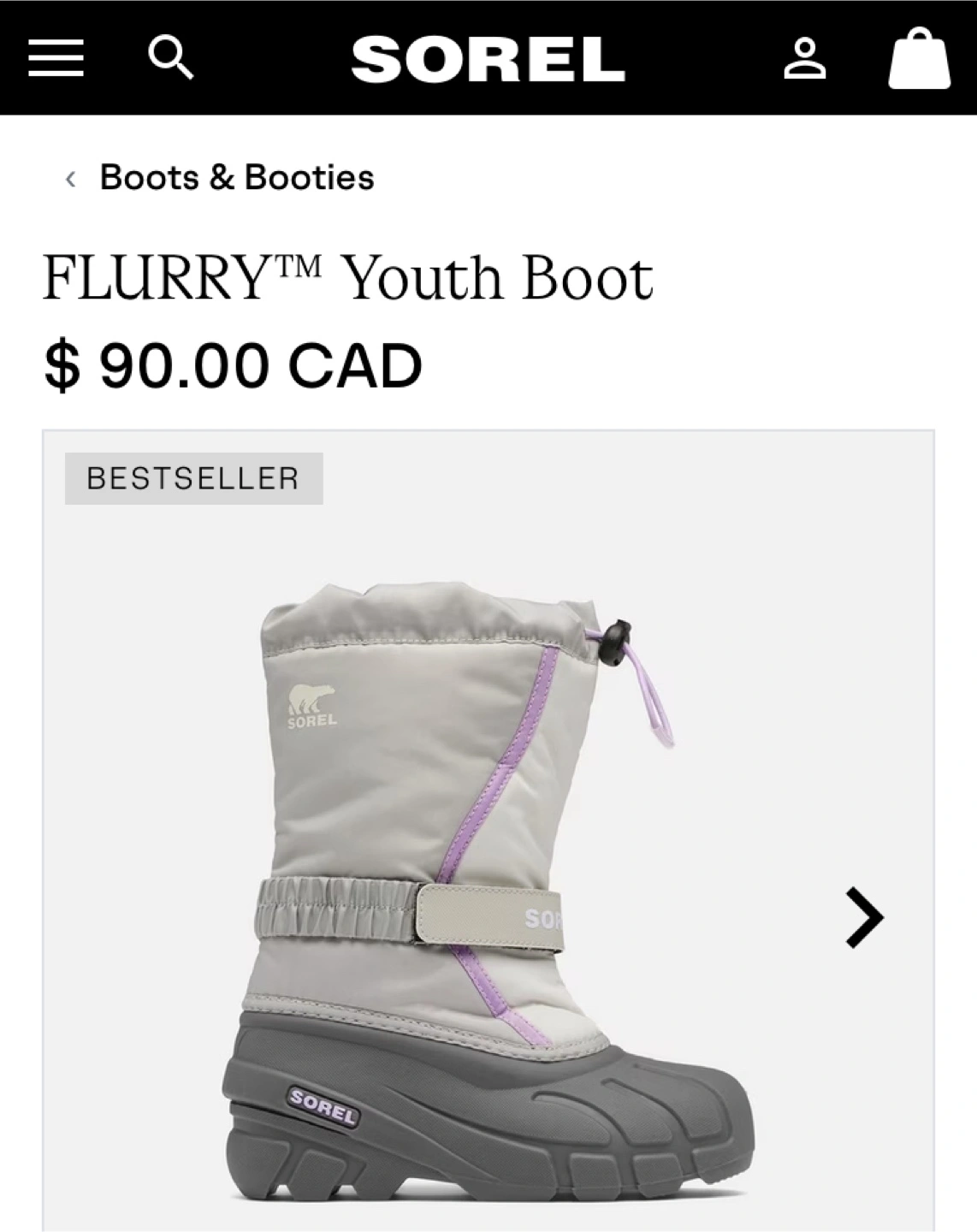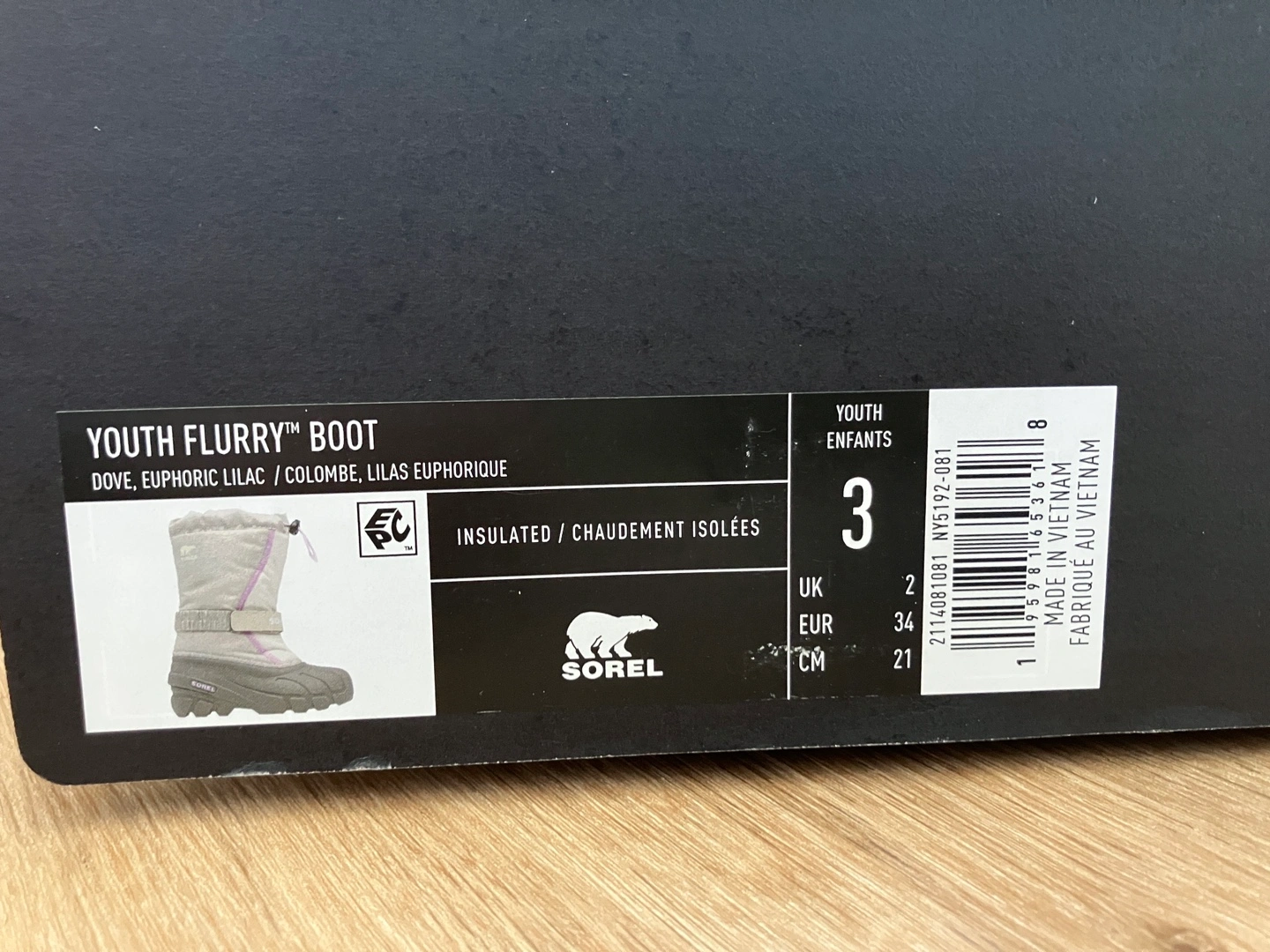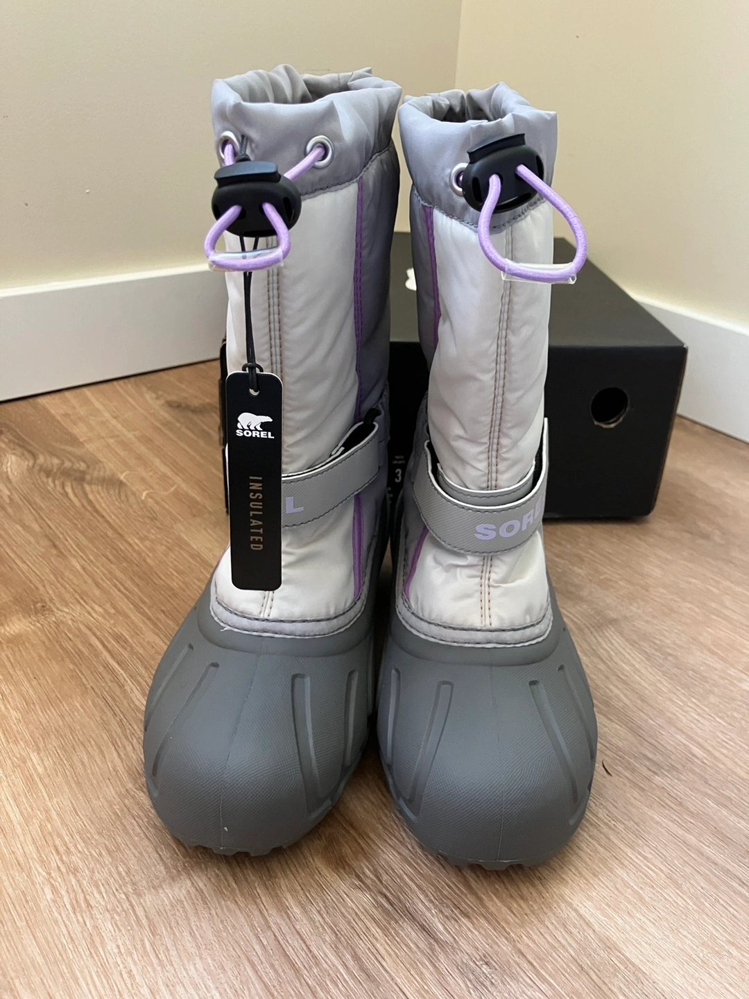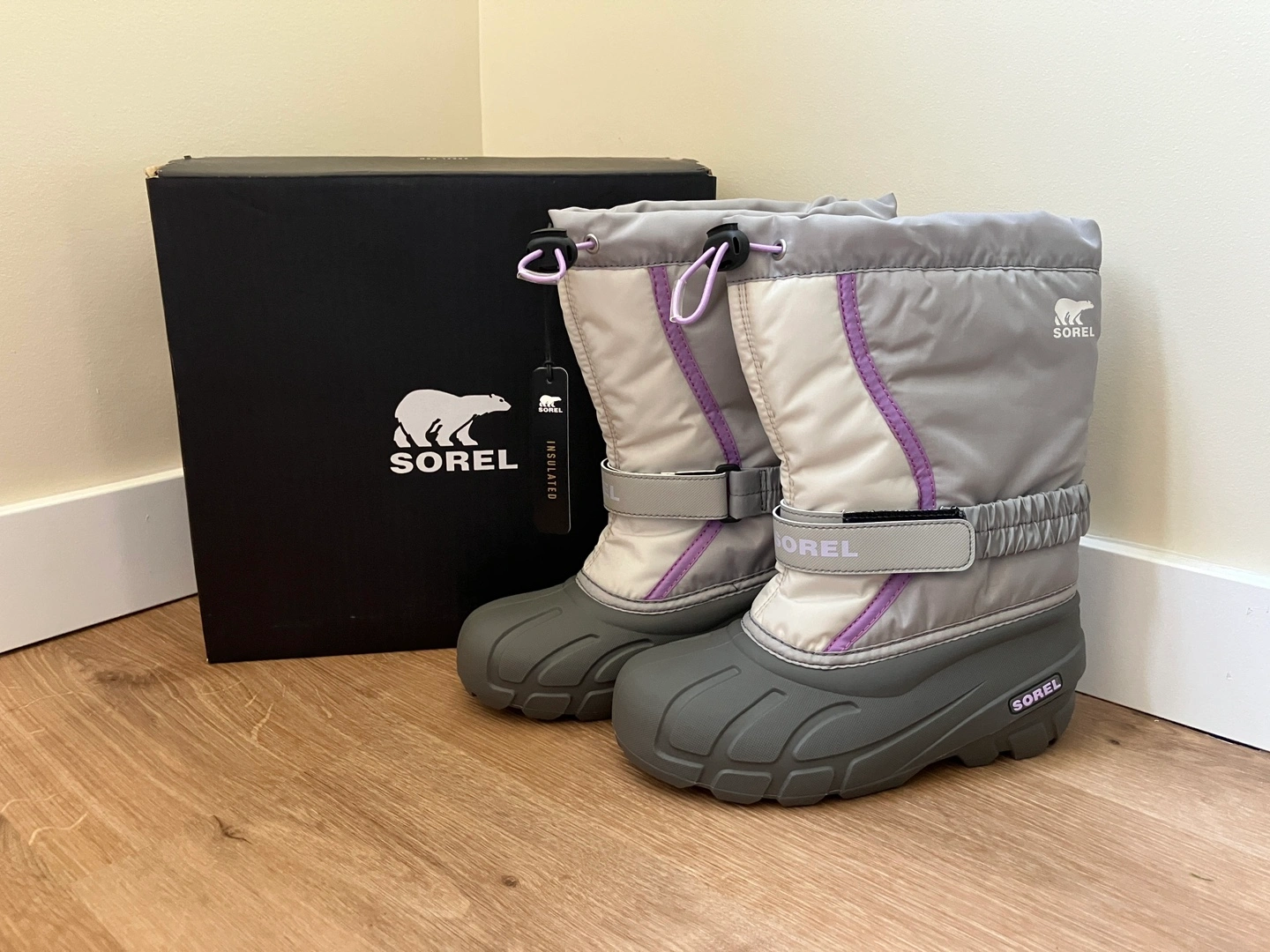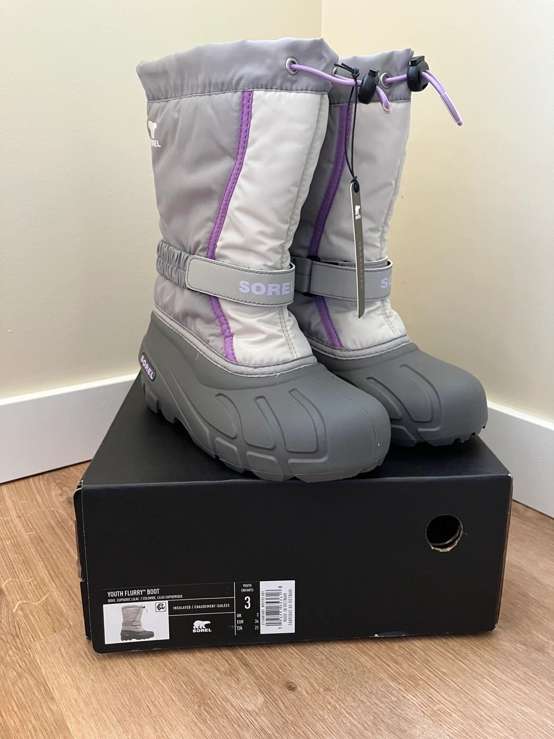 Sorel Youth Flurry Boots in size 3. The colour is Dove/Euphoric Lilac. They are insulated and come with the original box