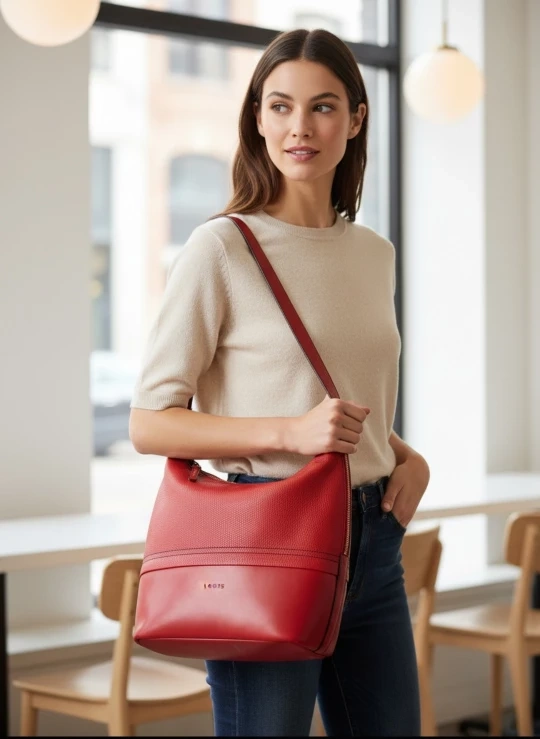 This is a Lodis shoulder bag made of Red Leather. It's in great condition and ready for a new home! The bag has a unique design with a smooth, glossy bottom and a textured upper portion. It's a stylish and functional accessory for any outfit. It comes with dust bag.