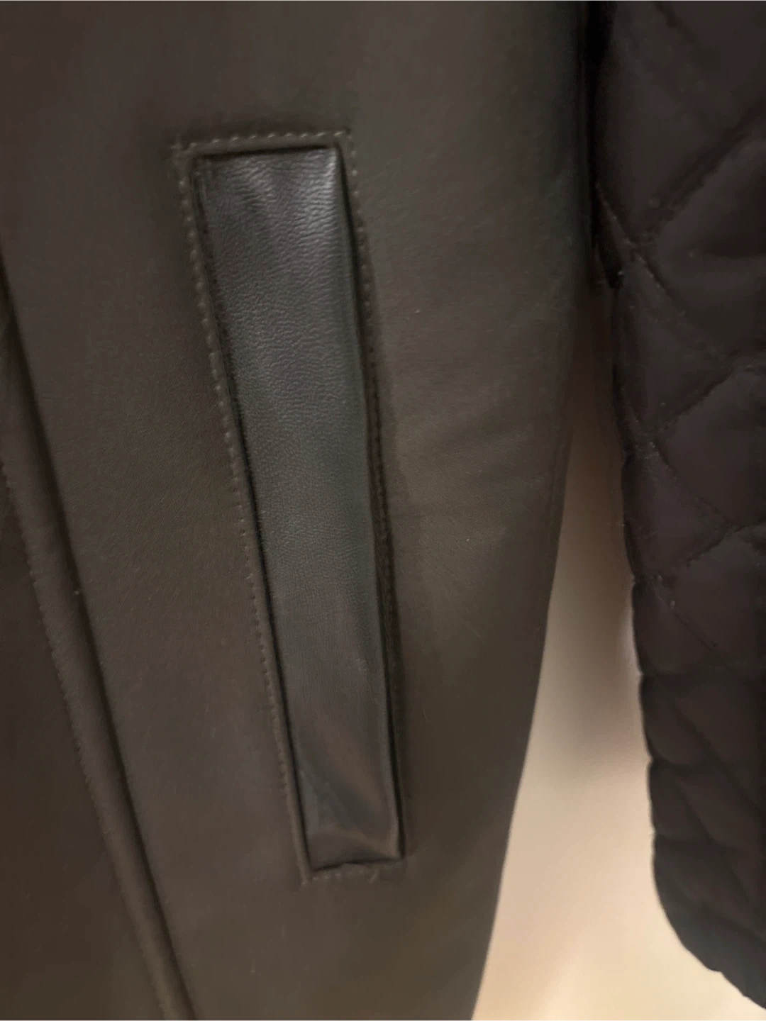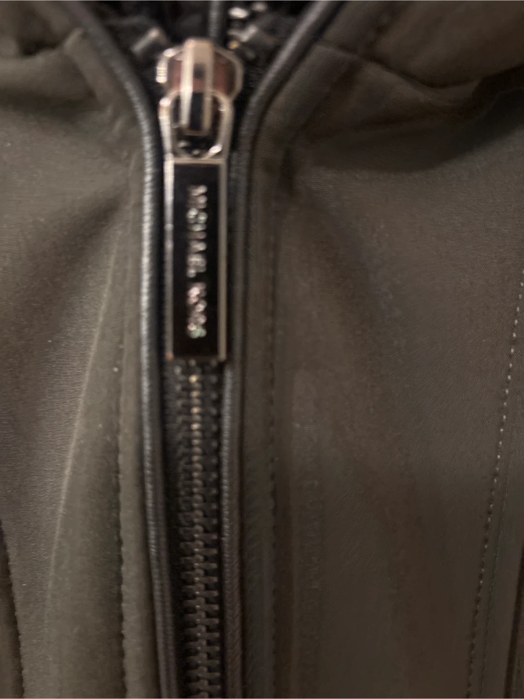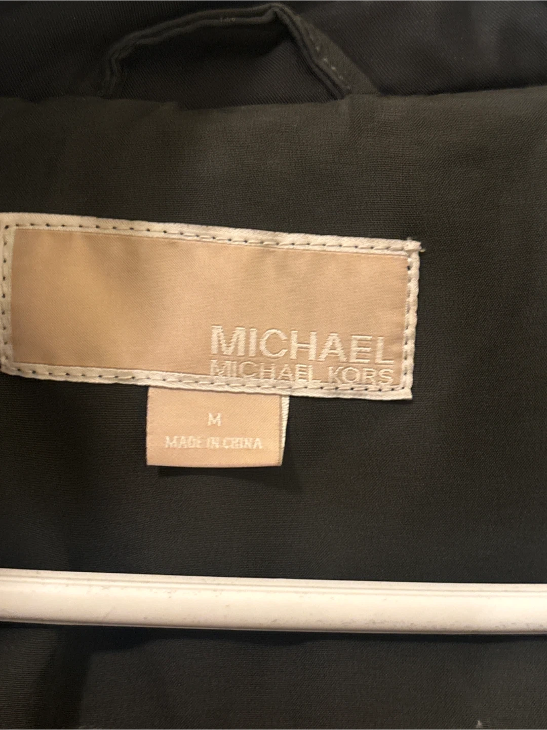 Selling a Michael Kors women's jacket in olive green. It's a size medium and features a quilted design on the sleeves and inner lining. This jacket is perfect for transitional weather!