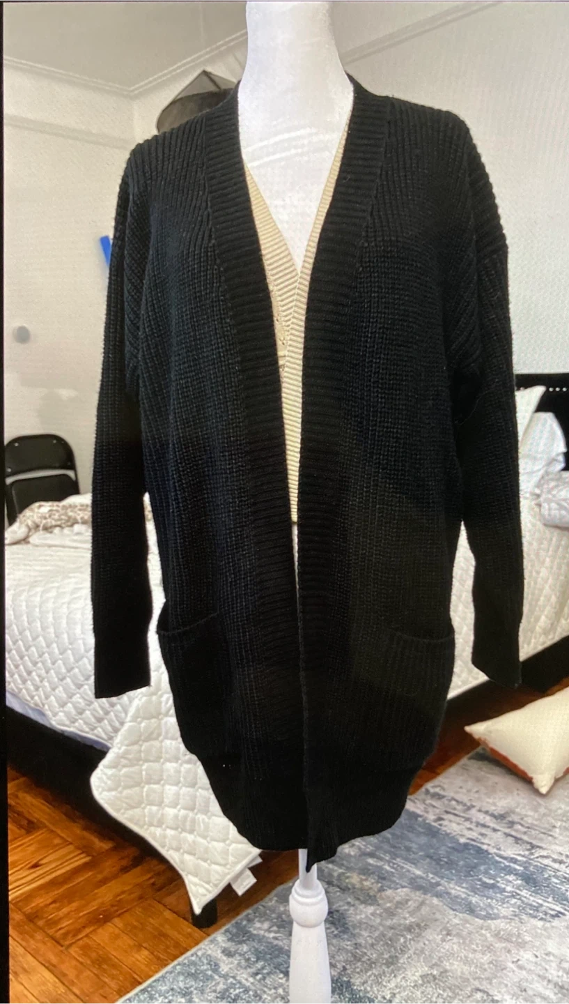 Buy & SellBlack Knit CardiganBlack Knit Cardigan$4Selling a cozy black knit cardigan! It's in great condition and perfect for layering. The cardigan features a comfortable, relaxed fit and handy pockets. Great for adding a touch of warmth and style to any outfit!SizeSmall 0 chats·0 favorites·2 viewsSELLERAliaDix Hills270 reviewsWHERE TO MEETCheck Location