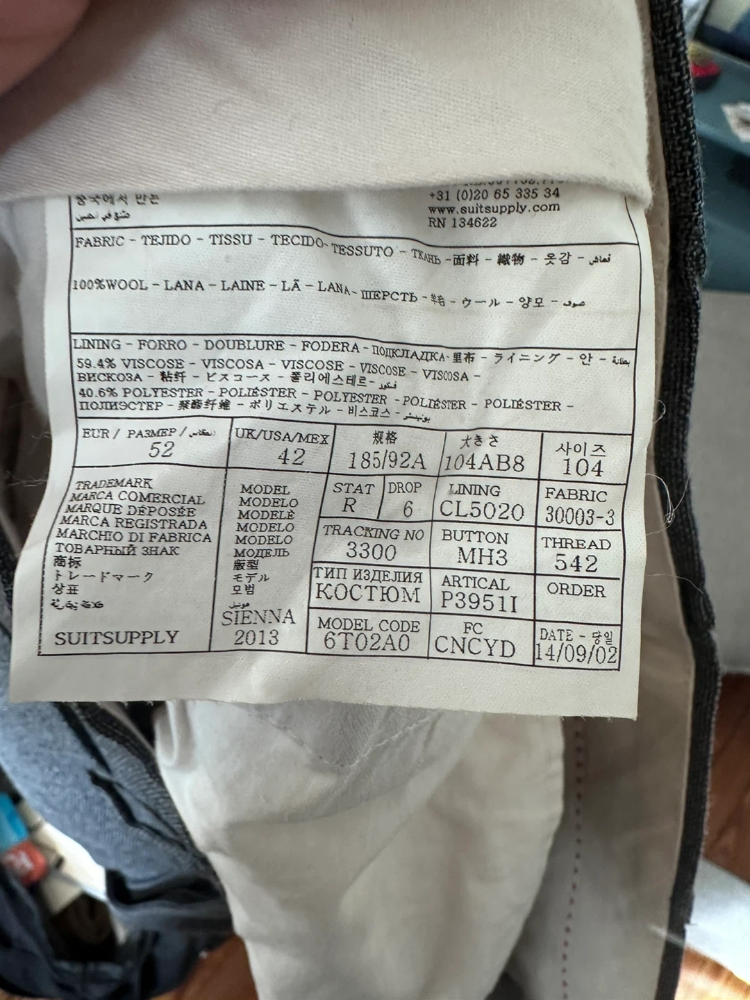 Buy & SellSuitsupply Sienna Gray Wool Suit - Size 42Suitsupply Sienna Gray Wool Suit - Size 42$112Selling a Suitsupply Sienna suit in gray. It's made of 100% wool and is a size 42. The lining is 59.4% Viscose and 40.6% Polyester. The model is 3300.ConditionGoodBrandSuitsupply0 chats·1 favorites·2 viewsSELLERverifiedChrisWoodside1155 reviewsWHERE TO MEETCheck Location