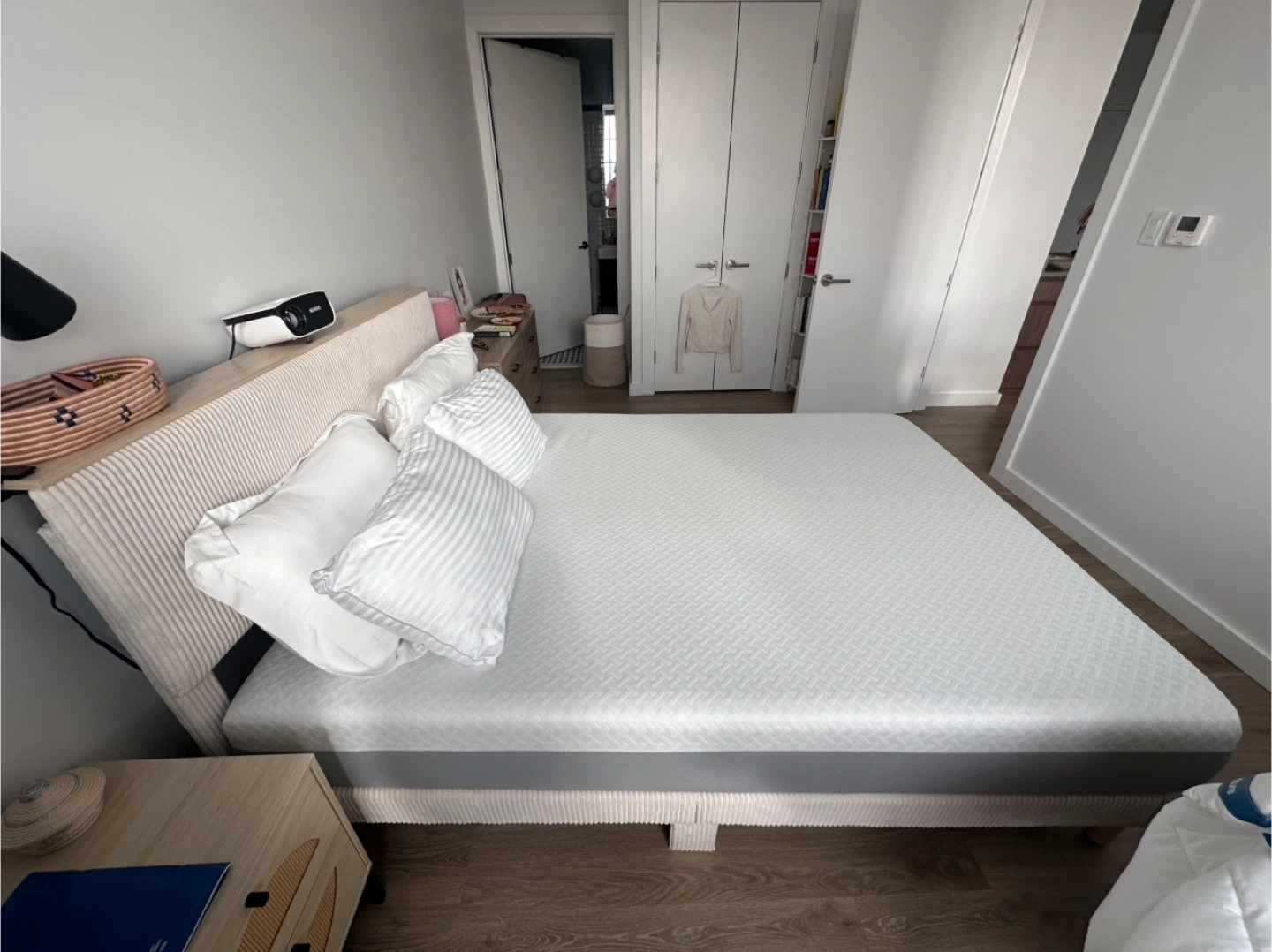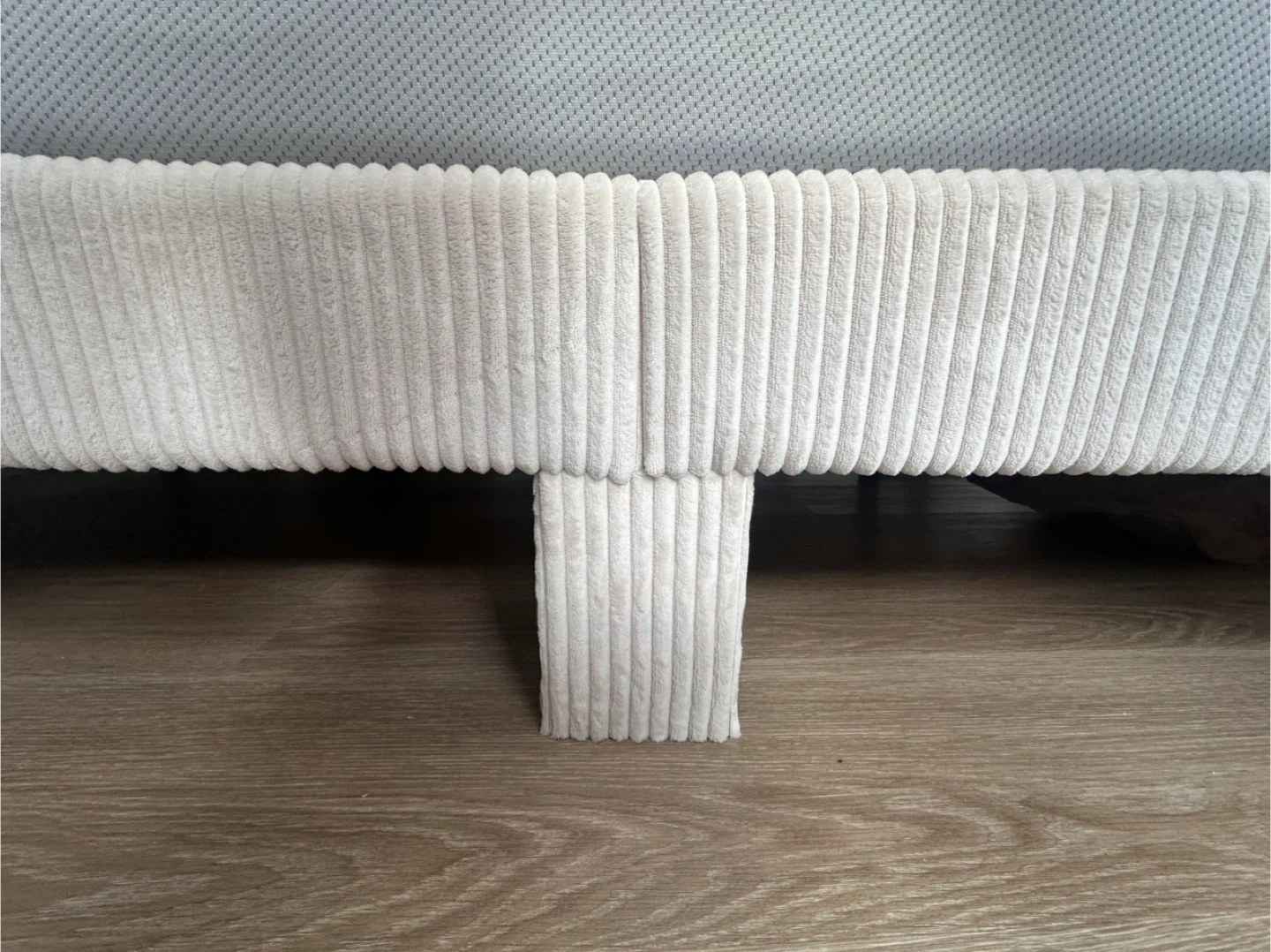 Selling a cream-colored corduroy platform bed. It's in great condition and would be a lovely addition to any bedroom!