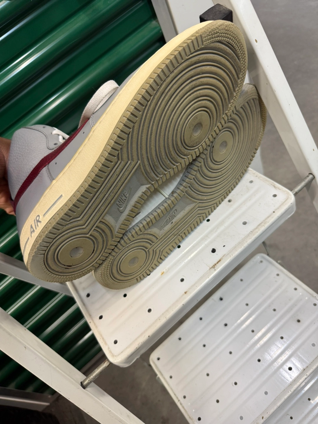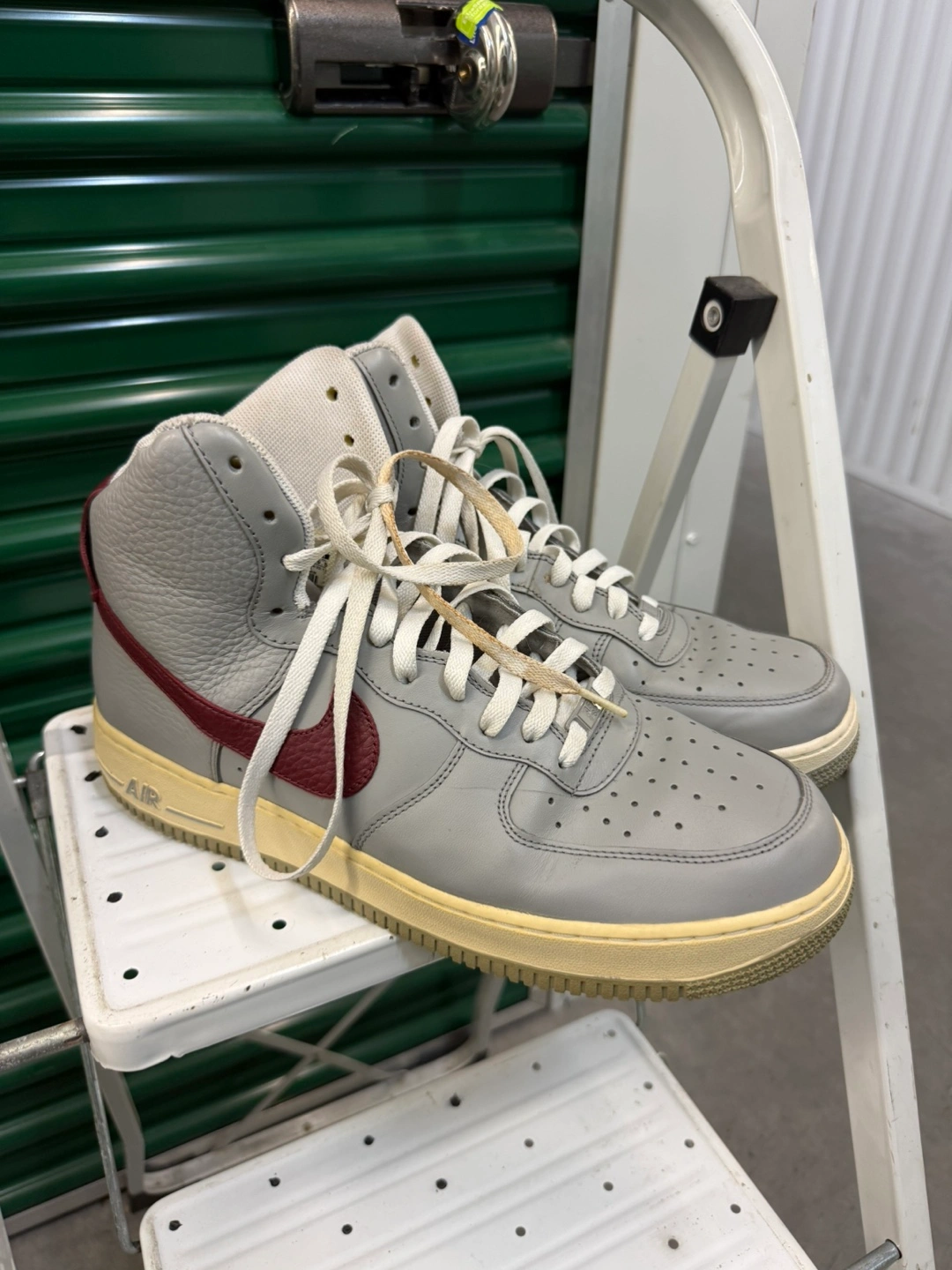 Selling a pair of Nike Air Force 1 High '07 shoes in size US 11.5. These classic high-tops feature a gray leather upper with a burgundy Nike swoosh and heel accent. The soles have a slightly aged, off-white appearance, adding to the vintage vibe. Check out the photos for a closer look!