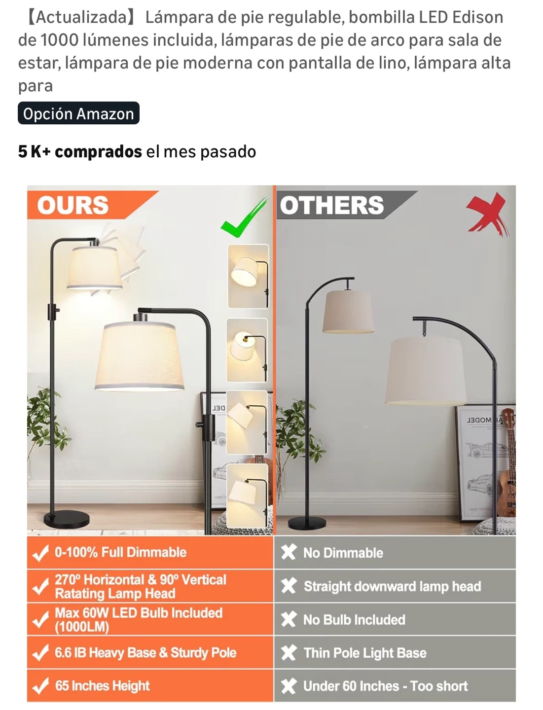 Selling a dimmable floor lamp featuring a natural linen hand-crafted lampshade! It includes an upgraded LED bulb with a 360° beam angle and an upgraded knob dimmer switch. The base is a 6.6LB weighted base with an anti-skid pad, offering children & pets protection. The lamp is 65 inches in height.