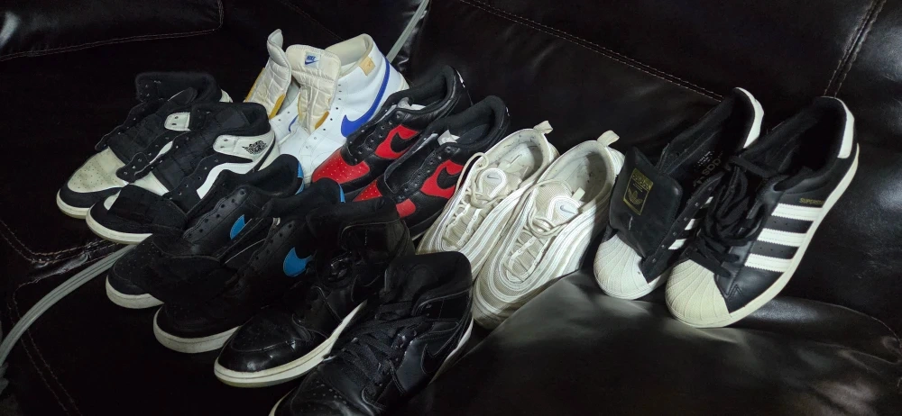 Buy & SellAssorted Sneakers: Nike, Adidas, Air JordanAssorted Sneakers: Nike, Adidas, Air Jordan$30Selling a collection of used sneakers, including Nike Air Max 97, Adidas Superstar, and Air Jordan models. Various sizes and conditions, please see photos for detailsConditionOkayBrandNike4 chats·0 favorites·38 viewsSELLERmichellLittle Village00 reviewsWHERE TO MEETescuela jhon spray