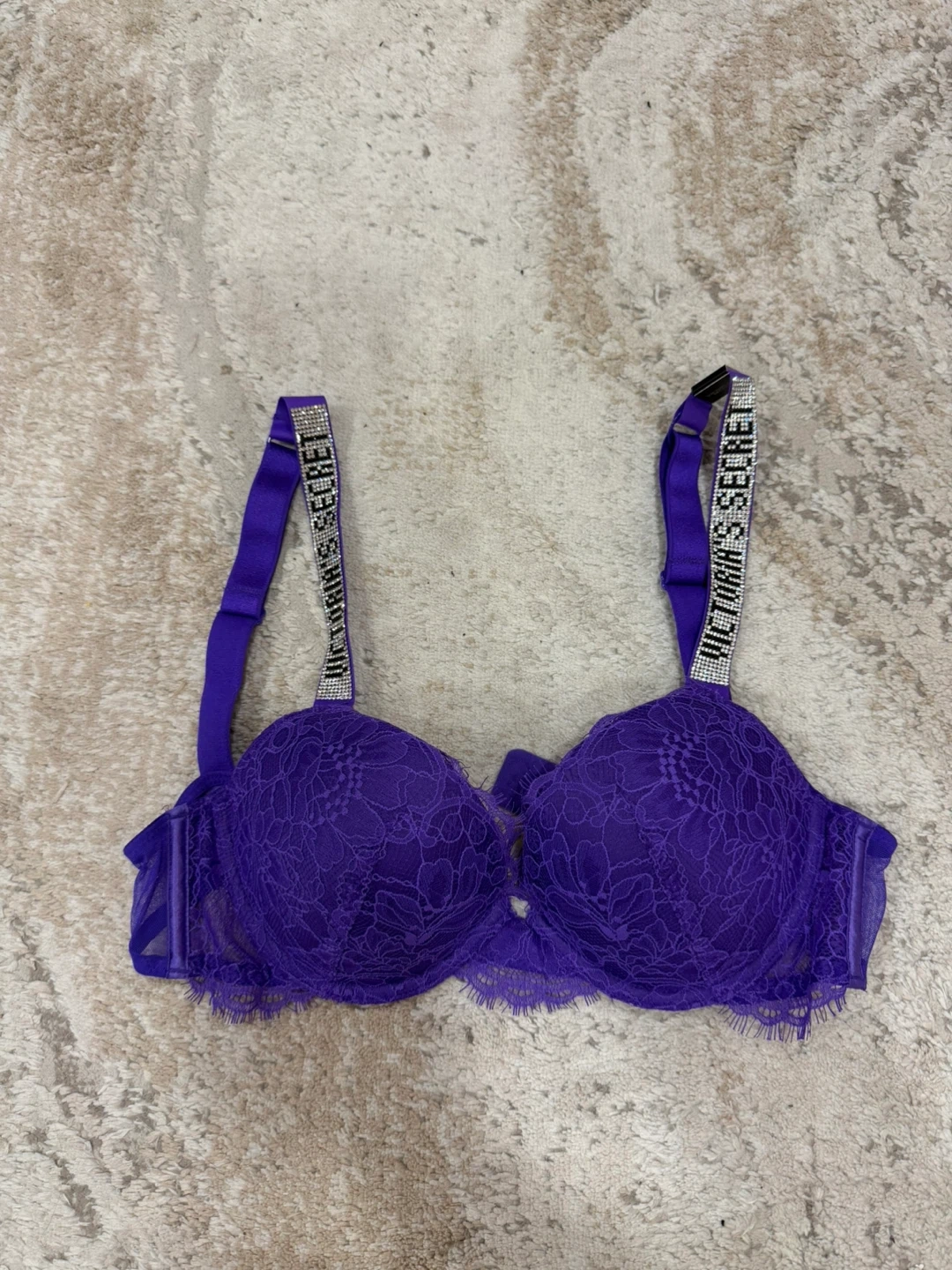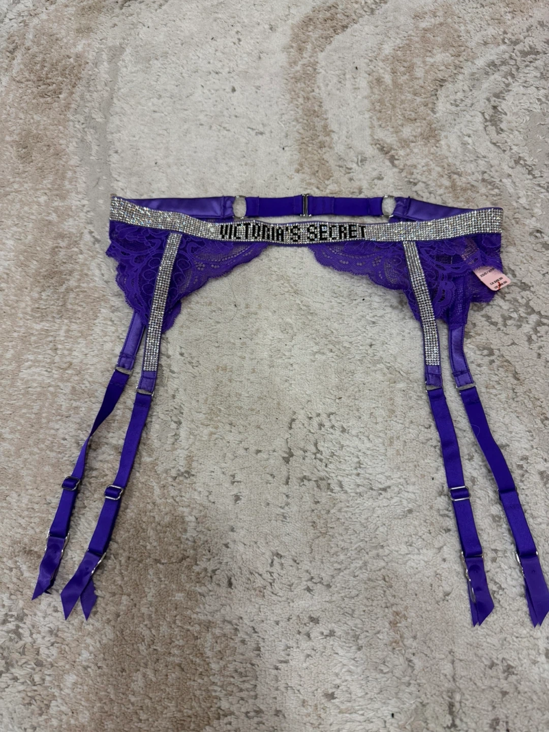Selling a beautiful Victoria's Secret lingerie set in purple. The set includes a bra and a matching garter . It features delicate lace detailing and rhinestone straps. The size is 34B for the bra and XS/S for the garter. New with tags!