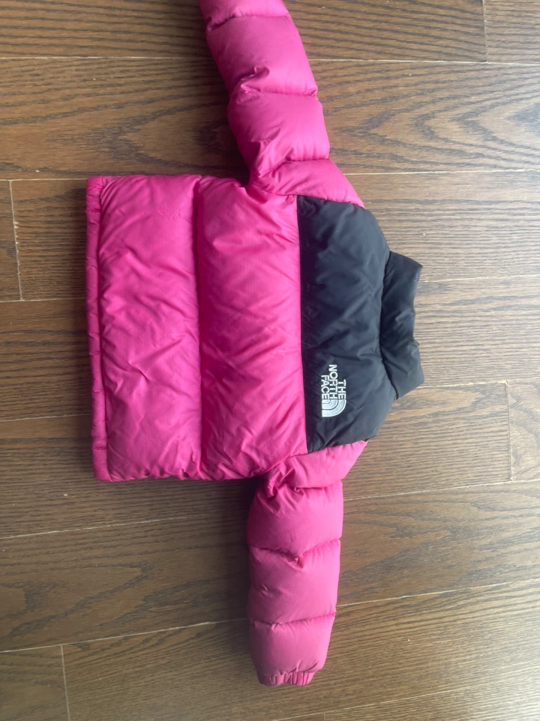 Selling a super cute The North Face puffer jacket for toddlers! It's a size 2T and features a stylish pink and black color block design. Perfect for keeping your little one warm and cozy!