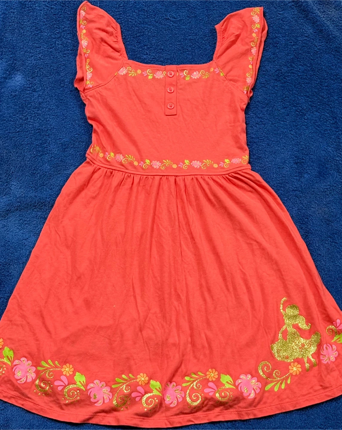 I'm selling a cute Disney Jumping Beans dress in size 7! The dress is coral colored and features a fun floral design with an elephant on the bottom. It's made of 60% cotton and 40% modal, making it super soft and comfy! Perfect for any Disney fan