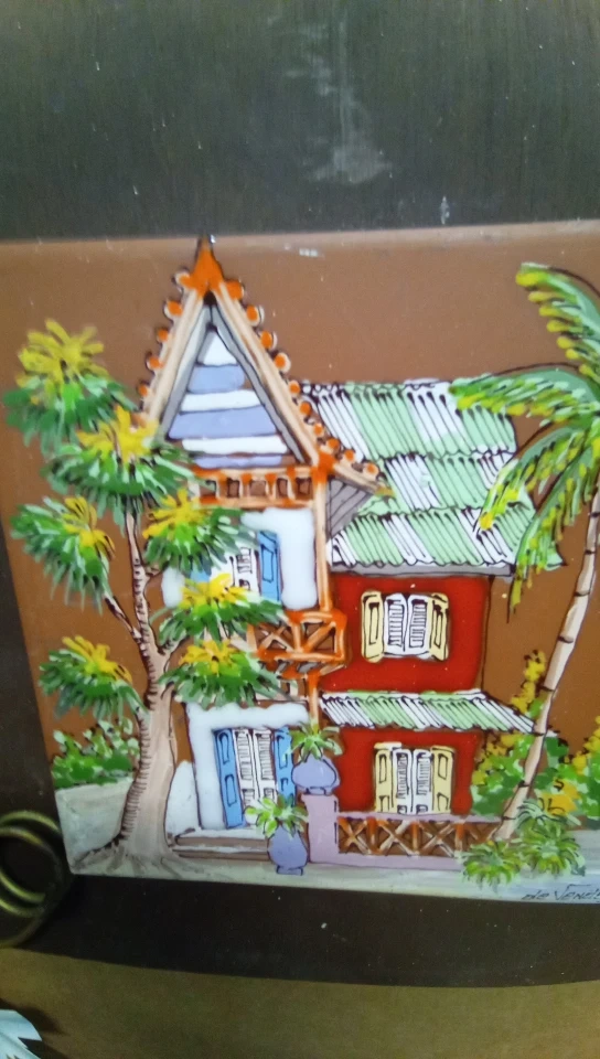 Selling a charming piece of tile art featuring a tropical house scene, signed by de Venelogies. The artwork is vibrant and detailed, perfect for adding a touch of island flair to any room! It's in great condition and ready to be displayed