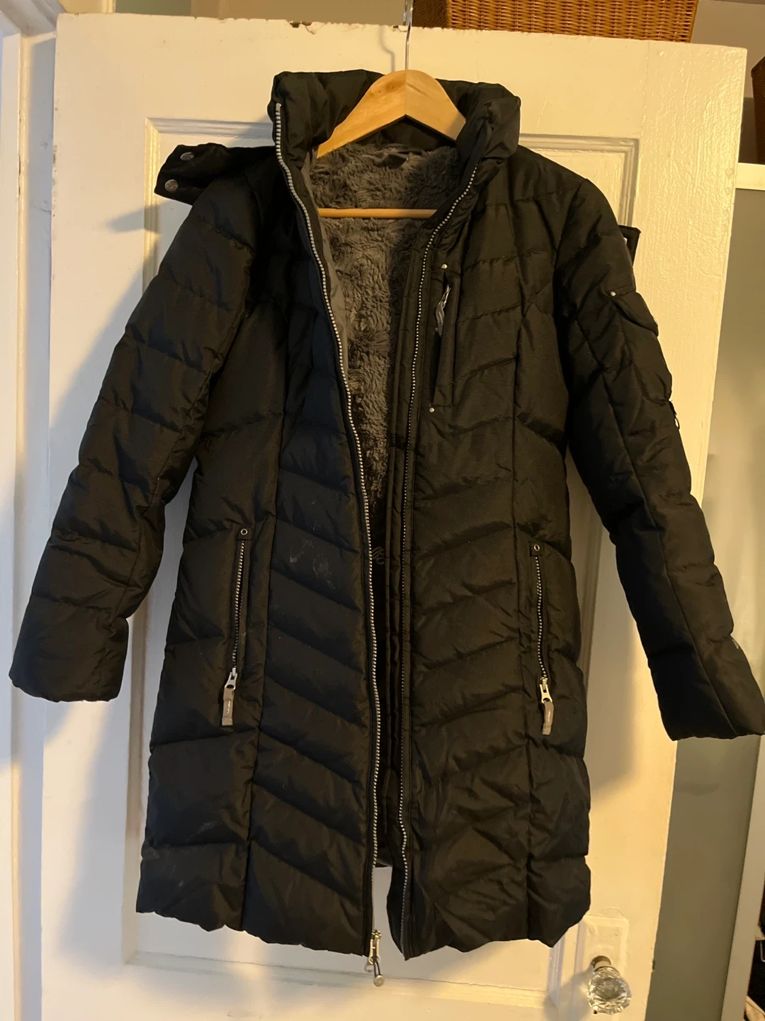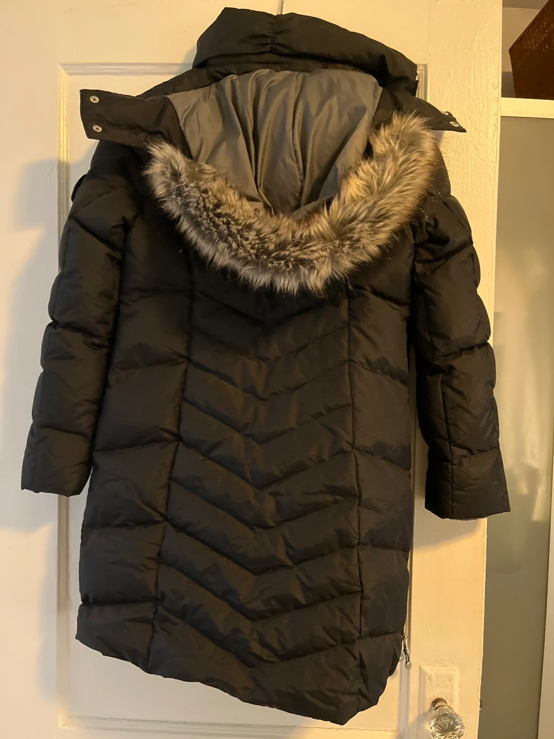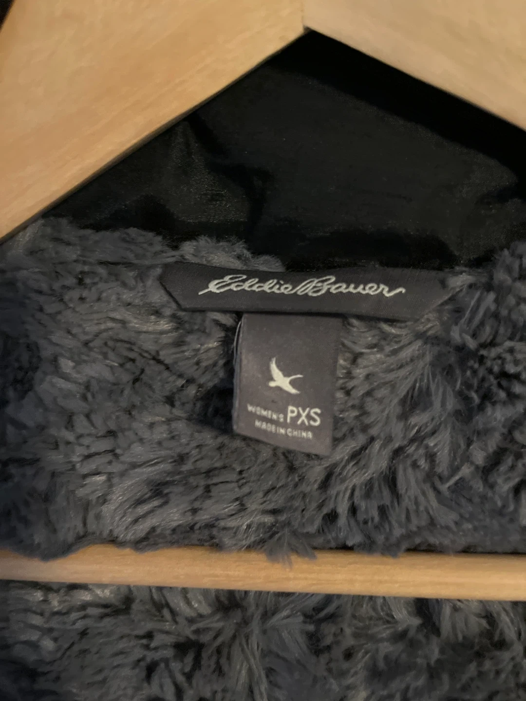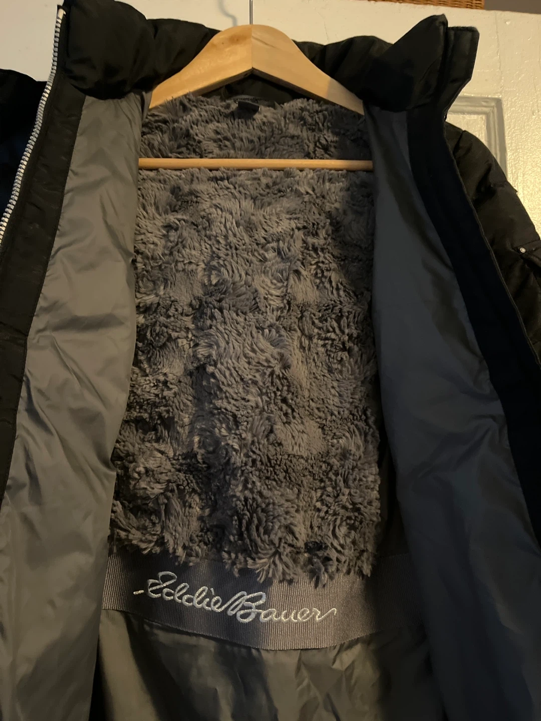 Selling an Eddie Bauer women's parka in black. It's a size PXS. The parka has a furry lining and a hood with fur trim, perfect for staying warm!