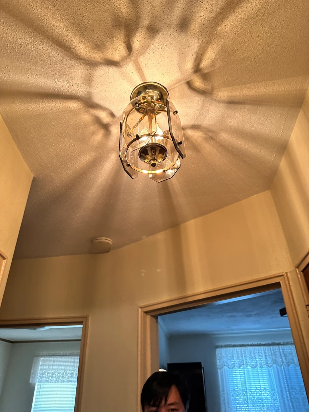This is a used ceiling light fixture. It has a brass finish and clear acrylic panels. It would be a great addition to any home.
