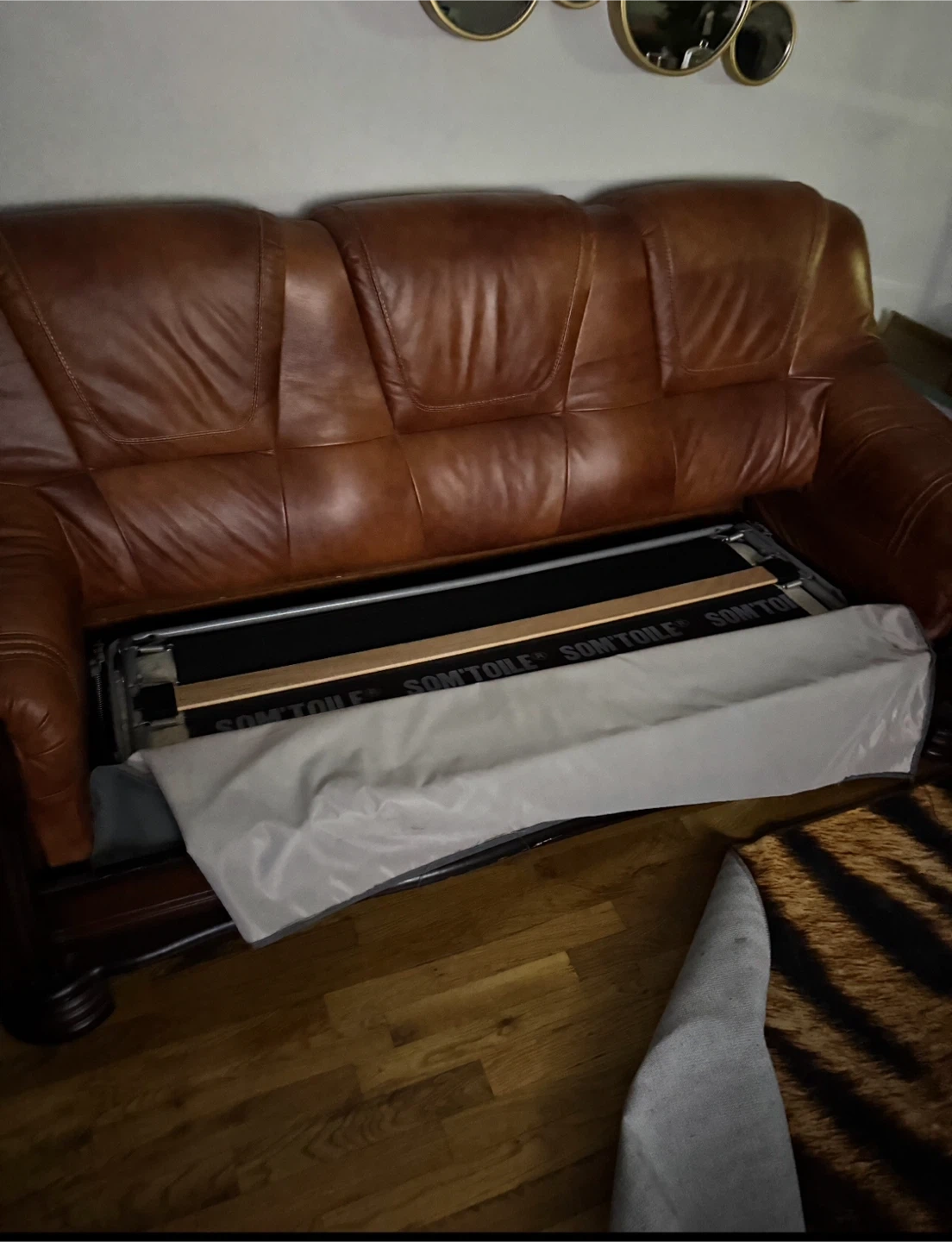 Selling a brown leather sofa in good condition. It's a comfortable and stylish piece of furniture that would look great in any living room. The sofa has a classic design with a rich brown color that complements various decor styles. It appears to be well-maintained, with the leather showing some signs of use but overall in good shape. Perfect for relaxing and adding a touch of elegance to your home, sit like a Boss in your Executive Office, Hm Library, Smoke Room, Cognac Lounge Room, Cigar Room, Your personal Boom Boom Lounge Room.