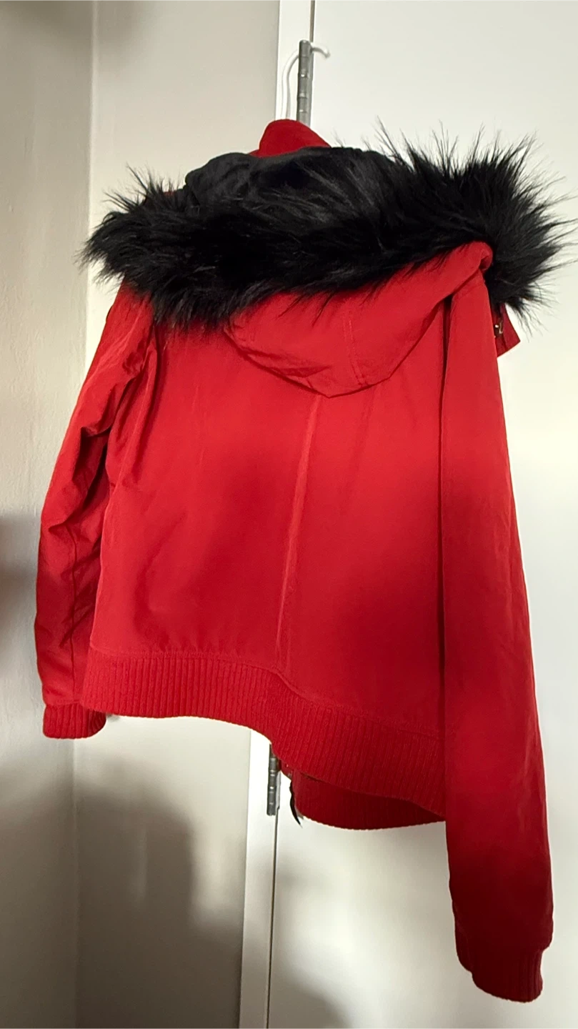Selling a Hollister All-Weather Collection jacket in size XL! It's a vibrant red color and features a cozy, plush interior lining. Perfect for staying warm and stylish during colder weather. The jacket also has a faux fur trim on the hood.