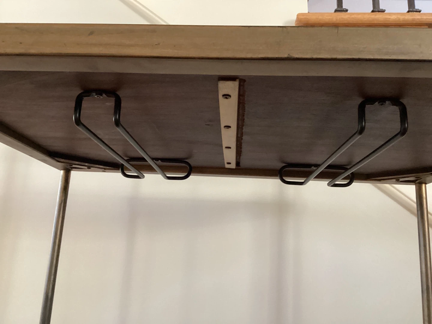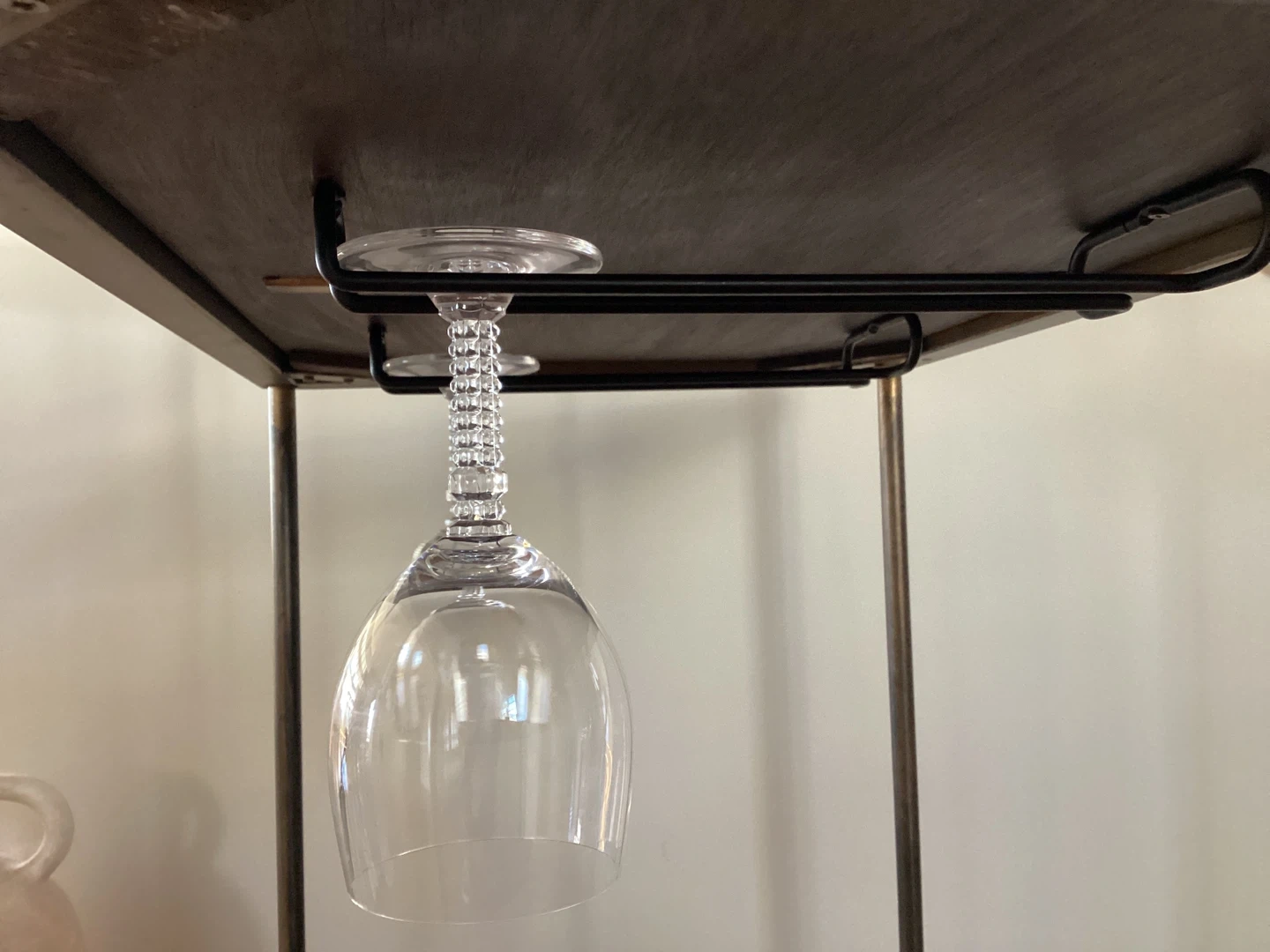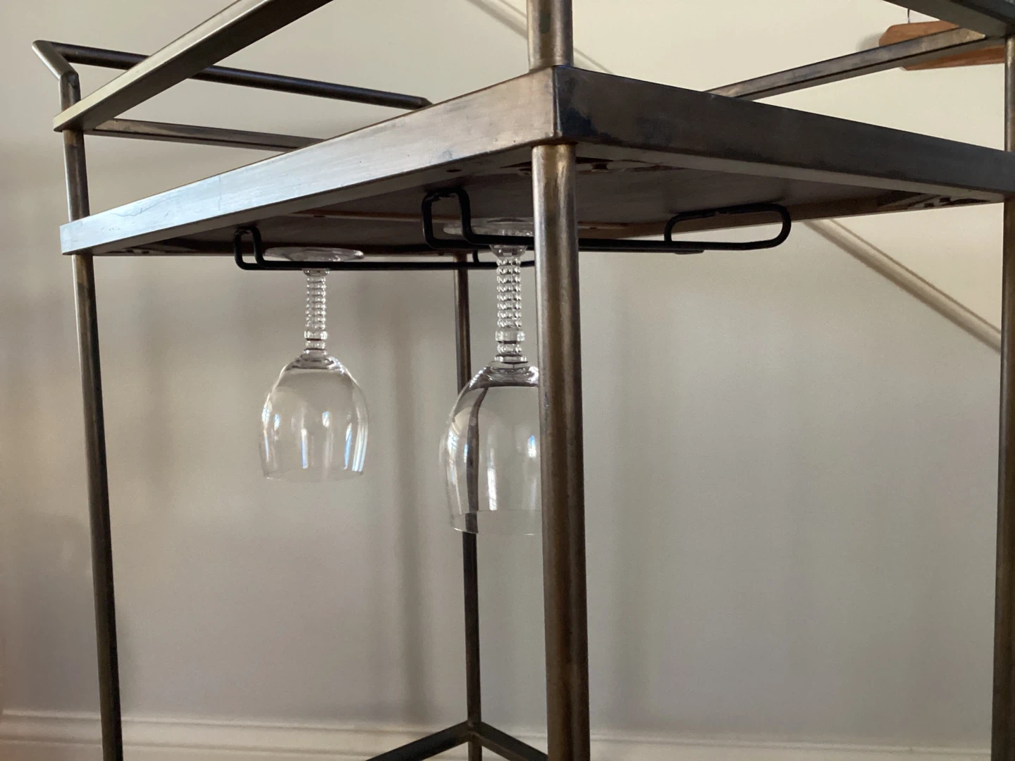 Selling a rolling bar cart with a bronze finish.It features two shelves and a rack for wine glasses.