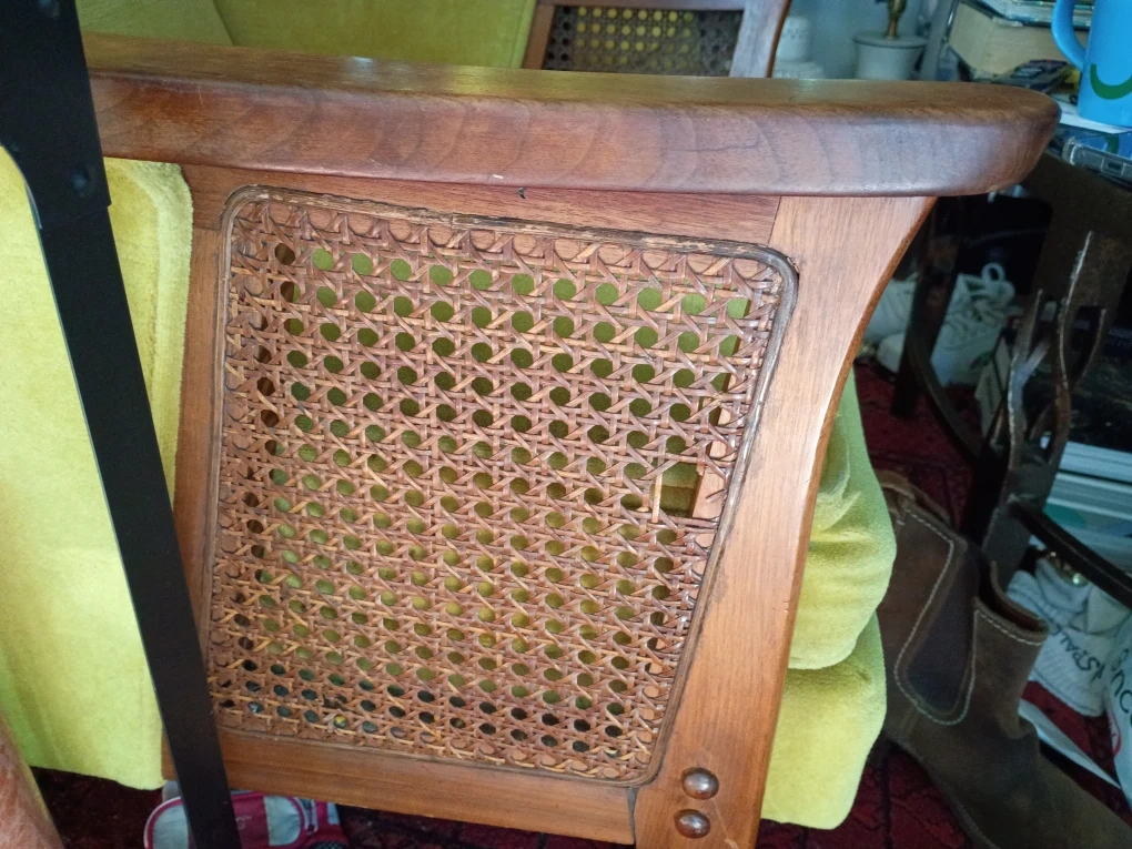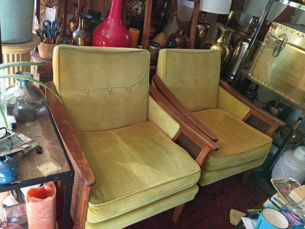 pair of vintage armchairs. They have a unique design with wooden frames and woven cane detailing on the sides. The cushions are a soft, muted yellow color. Each chair has damage to the cane in the same right arm ( 1 a little more than the other.) But way I have them arranged, you can't tell at all.