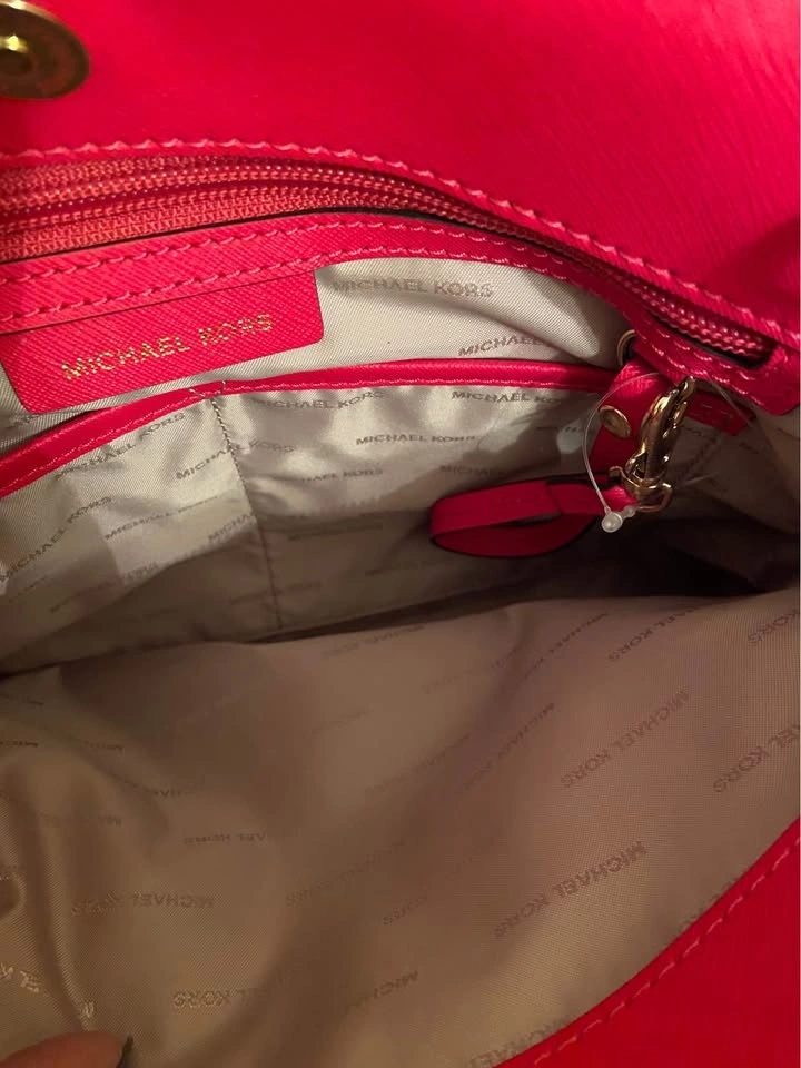 Has MK round gold logo hang tag, with hot pink leather disc hanging behind…in perfect condition.