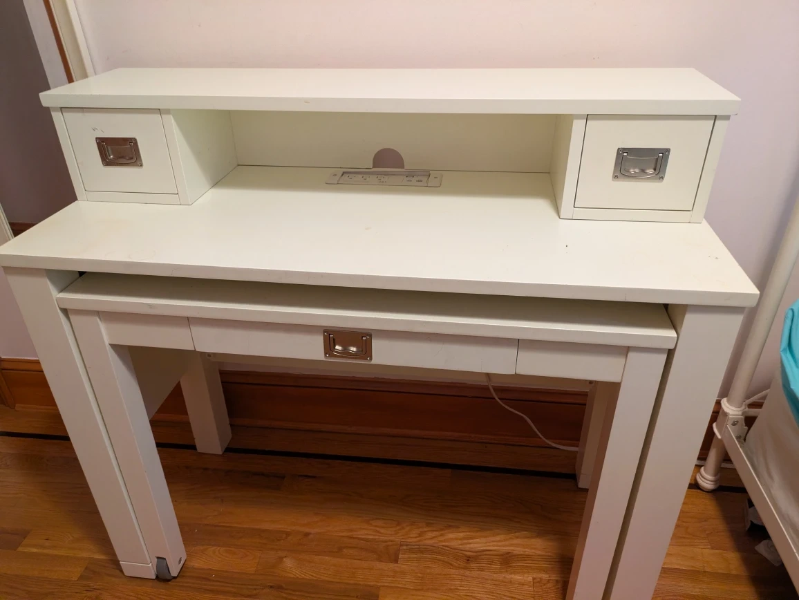 Selling my daughter"s white Pottery barn desk she has outgrown that's in good condition! It features a pull-out work station with center drawer and two drawers on top for extra storage. It also has built-in power outlets on the desk surface, which is super convenient!