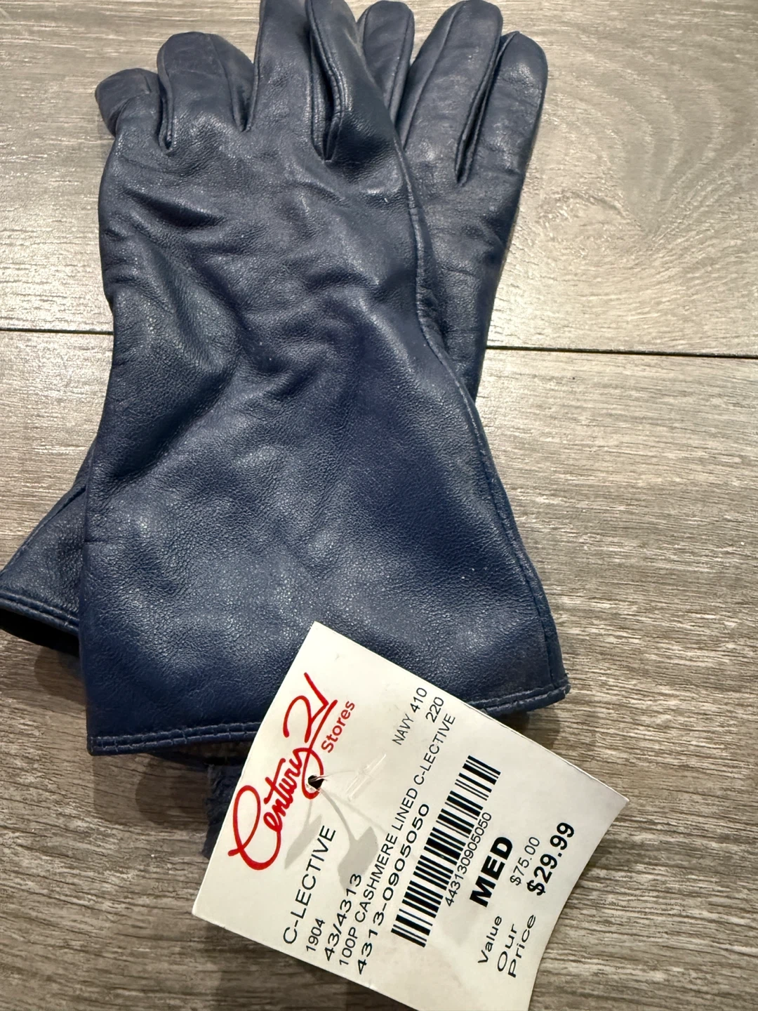 These are a pair of navy blue gloves from Century 21. They are made of genuine leather with a 100% cashmere lining. The size is M. Originally priced at $29.99