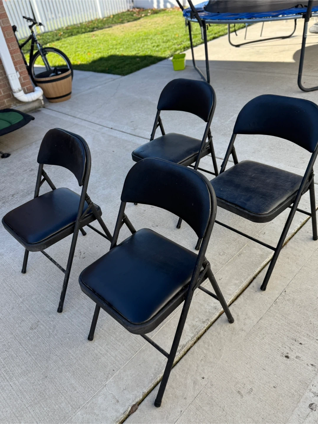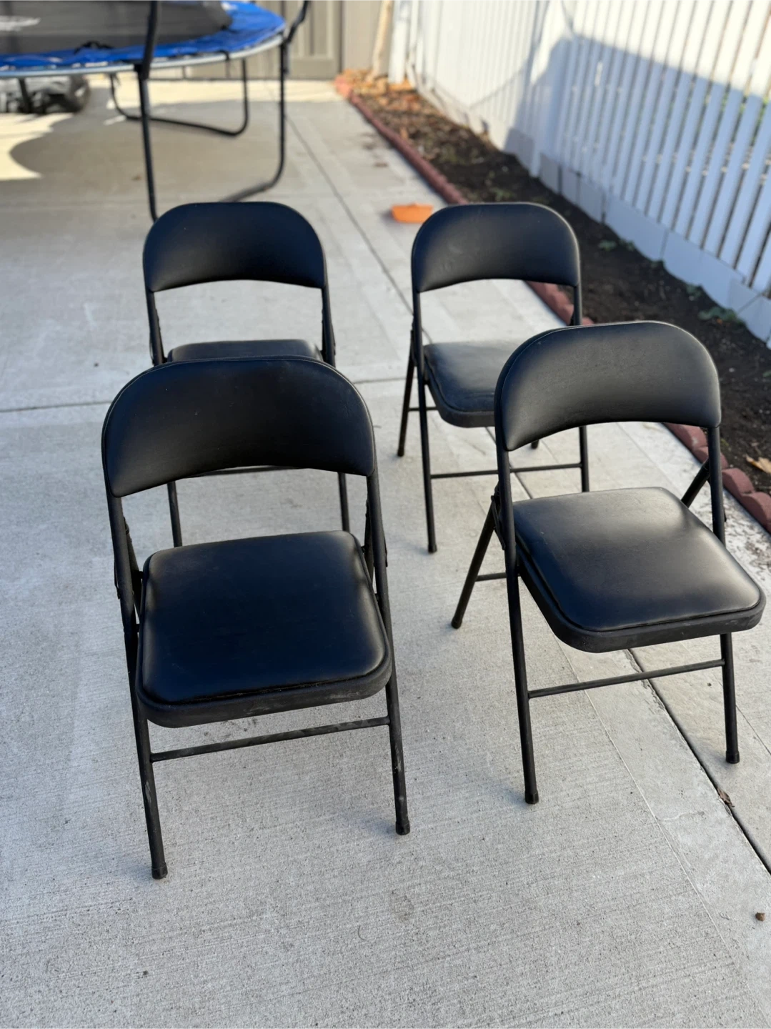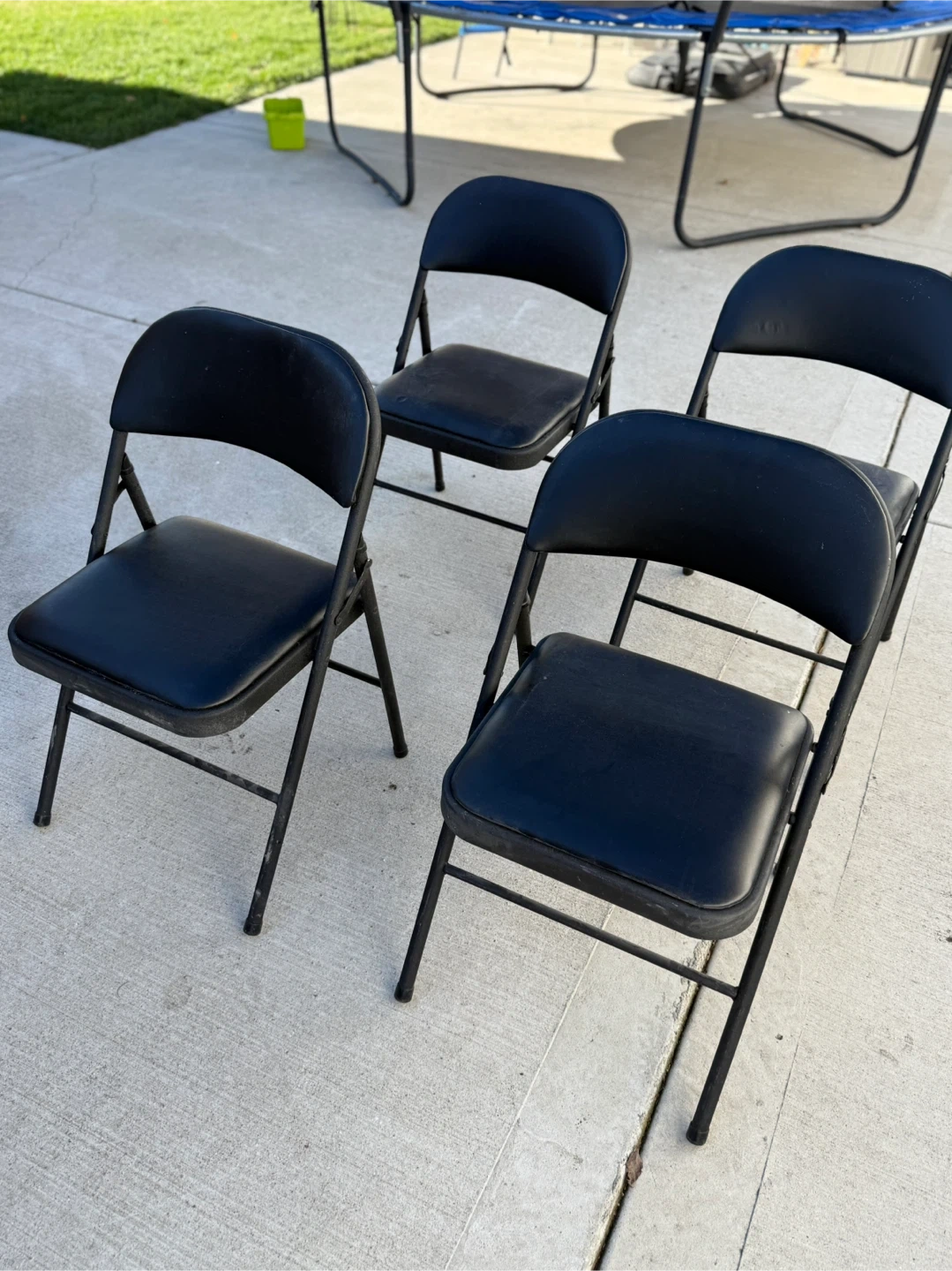 Selling a set of four black folding chairs! These are great for extra seating at gatherings, parties, or just for everyday use. They're in good condition and ready to go to a new home. Perfect for indoor or outdoor use!