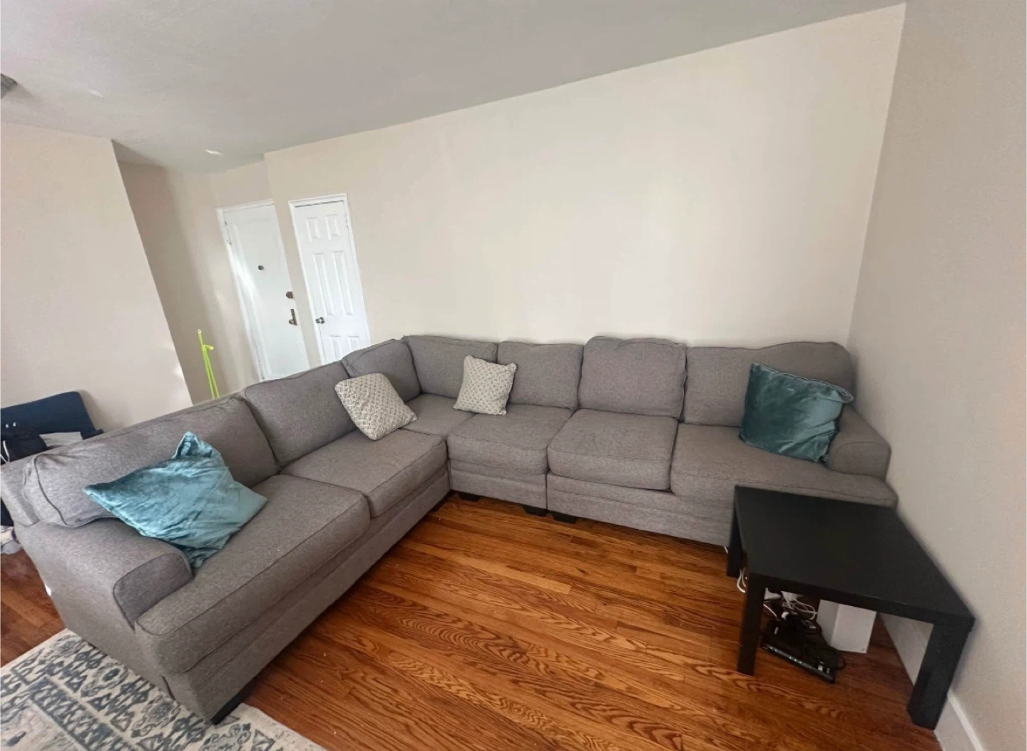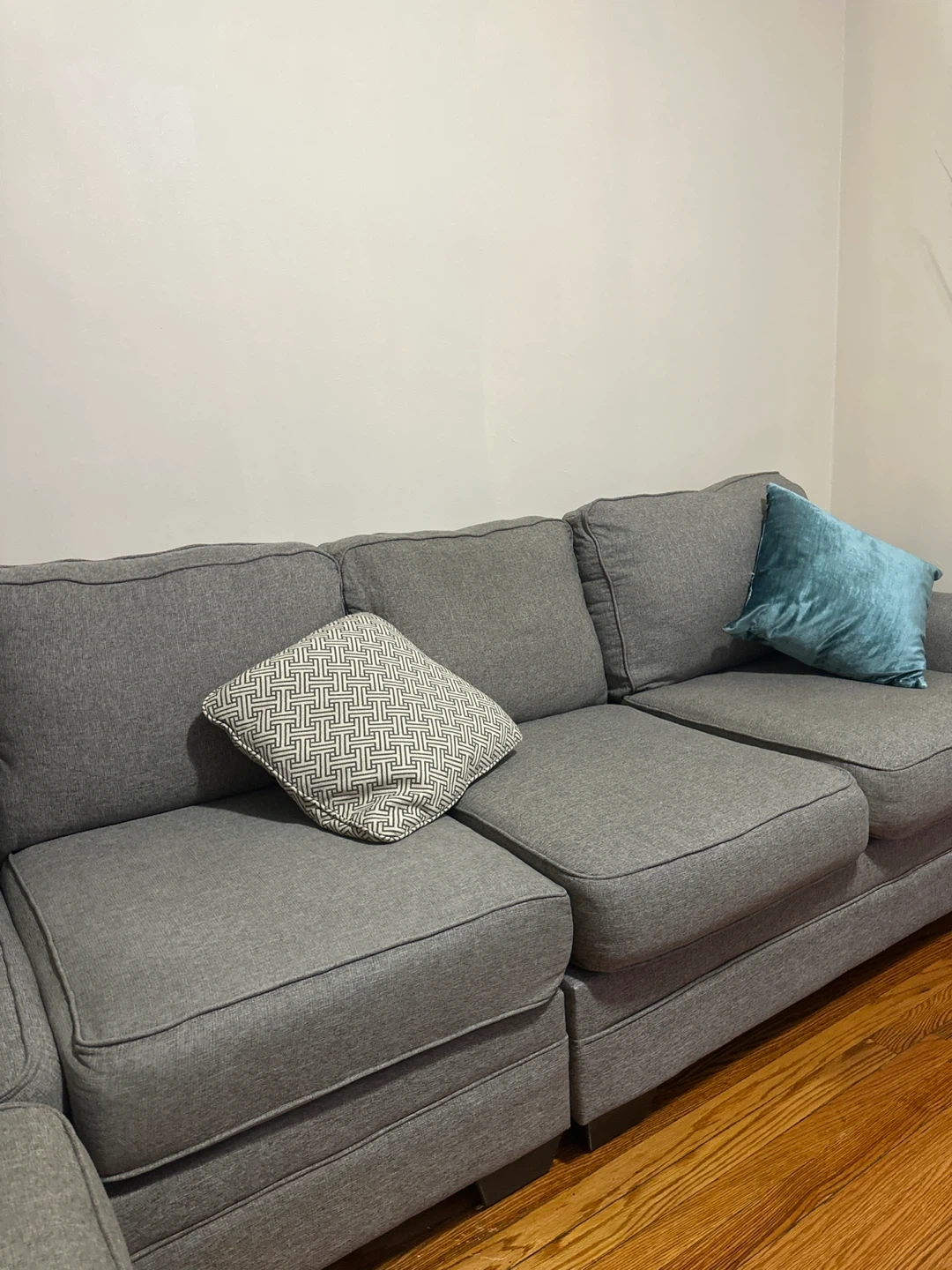 The sofa has supportive cushions, soft gray upholstery, and a spacious L-shape design — perfect for a living room, family room, or apartment.