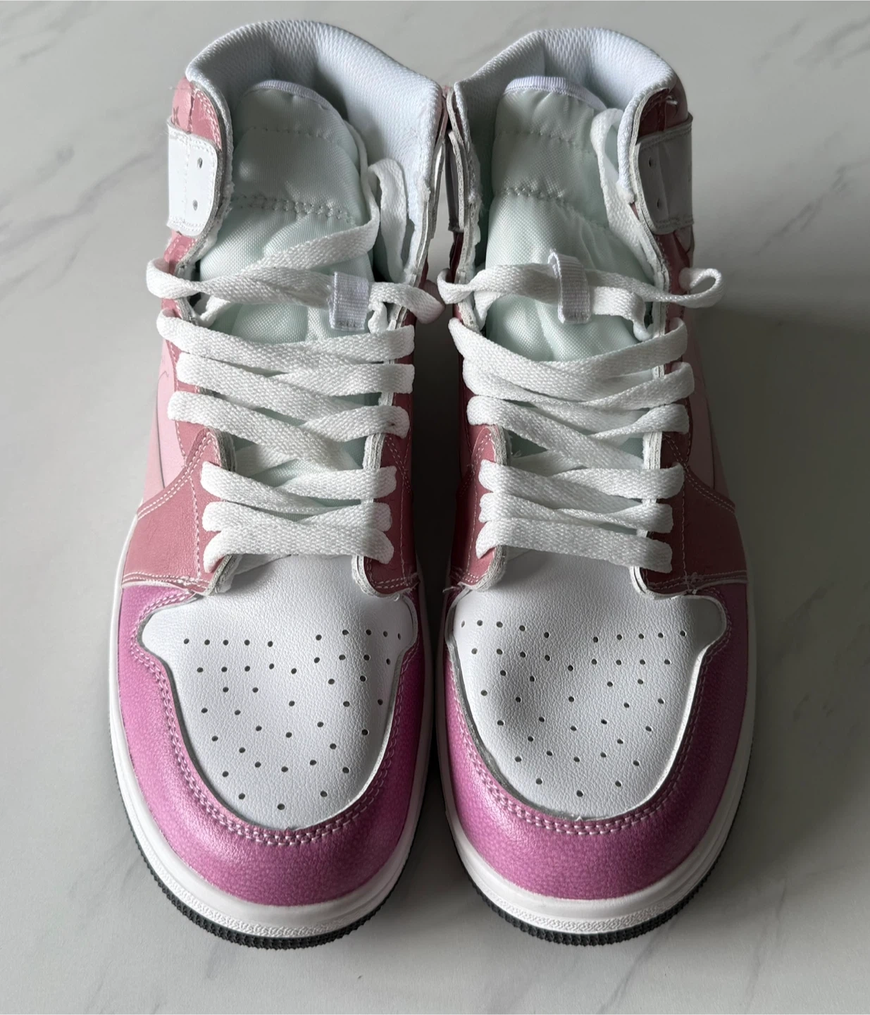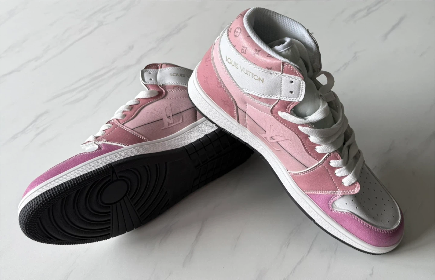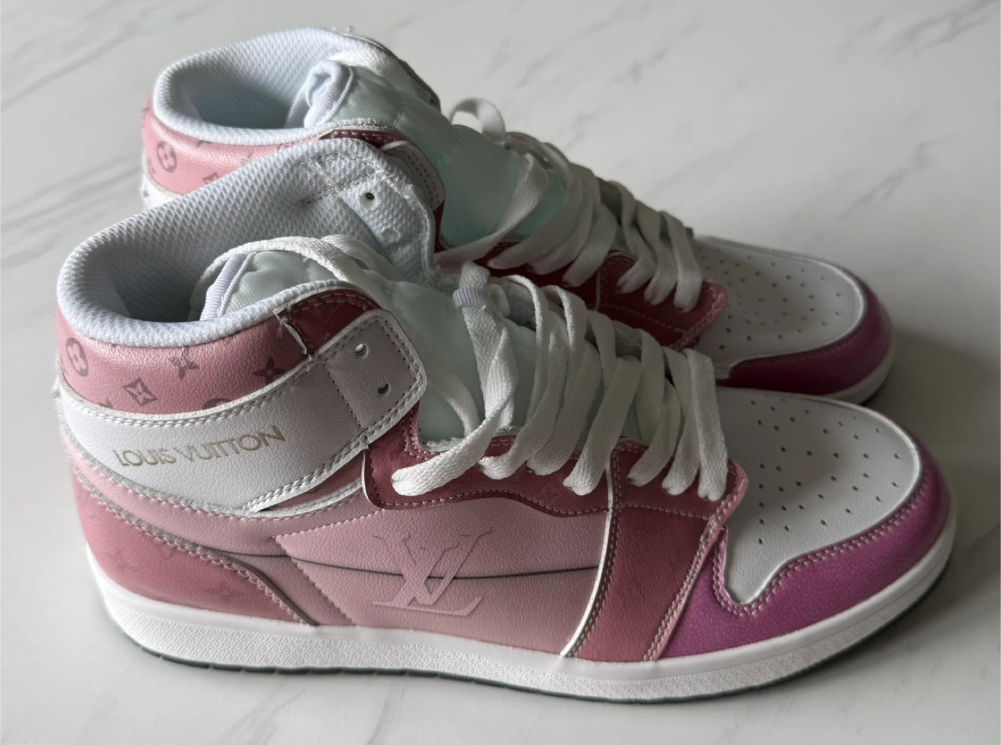 Selling a pair of non Original Louis Vuitton high-top sneakers in a lovely pink color. These stylish shoes feature the iconic LV logo and design. They are in great condition and ready for a new home!
