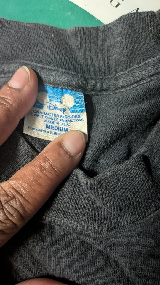 Selling a vintage Disney t-shirt featuring Mickey Mouse! It's a size medium and made in the USA. The shirt is black with a classic Mickey Mouse design. Great for any Disney fan!