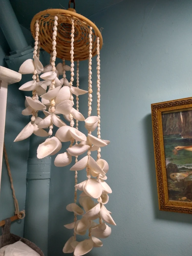 This is a seashell mobile that would look great in any room! It's in great condition and ready to hang. It features a woven top and multiple strands of seashells.