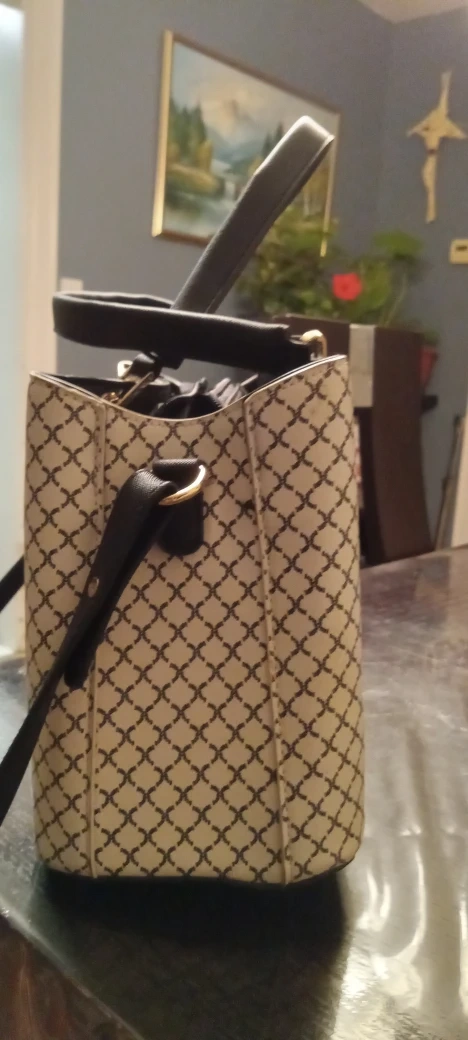 Here's a tote bag with a unique patterned design! It features black handles and trim, adding a touch of contrast to the overall look. It's a stylish and practical accessory for carrying your essentials