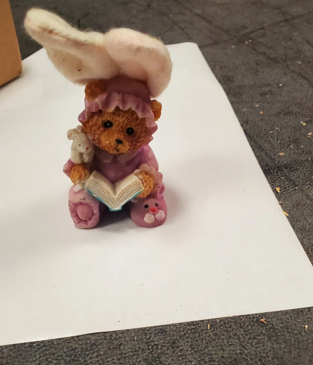 This is a charming Cherished Teddy Bearstone bunny figurine, perfect for collectors or anyone who loves adorable decor! It features a cute bear with bunny ears, reading a book, and holding a little lamb. It's in good condition and ready to brighten up your space