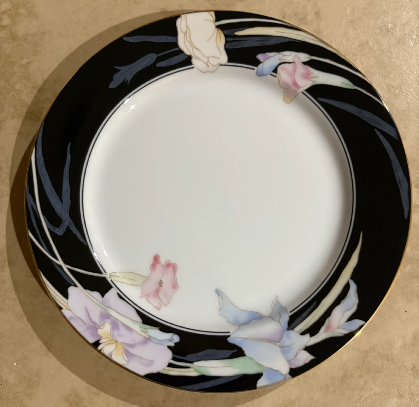 These plates are in great condition and feature a beautiful floral design with a black rim. Perfect for adding a touch of elegance to your dining table!
