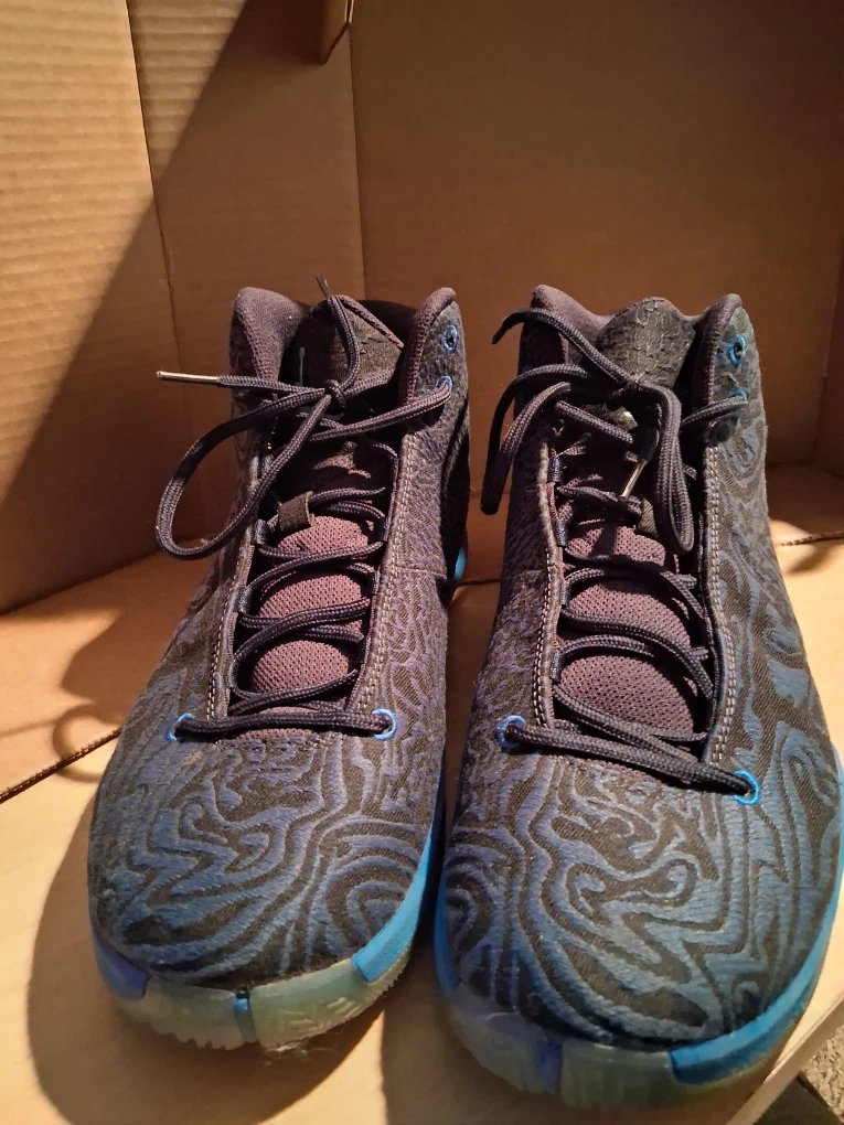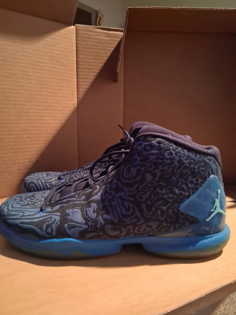 Selling a pair of Jordan Aero Mania high-top sneakers! They feature a unique blue and black swirl pattern and the iconic Jumpman logo. Great for basketball or casual wear!