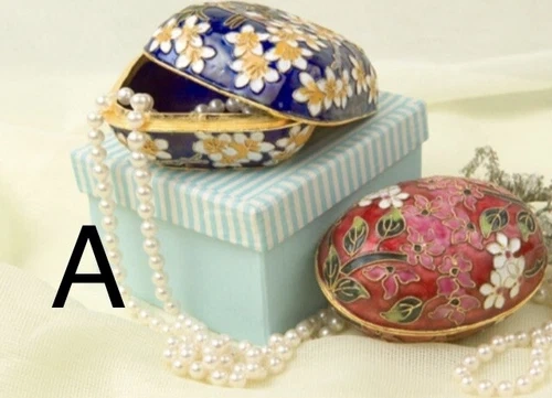 Hand crafted Cloisonné Enameled Trinket jewelry box About 3”Very sturdy won’t break Copper base enameled by hand and plates with 10k gold over Lasting beautiful heirlooms make a great holiday gift Come gift boxed Please choose a design from the picture Sold by 1 piece PLEASE SPECIFY WHICH DESIGN YOU D LIKE TO ORDER BY ADDING A LETTER IN THE ORDER NOTES STYLES - A (blue square) Or B (red oval) Discount is available on qty