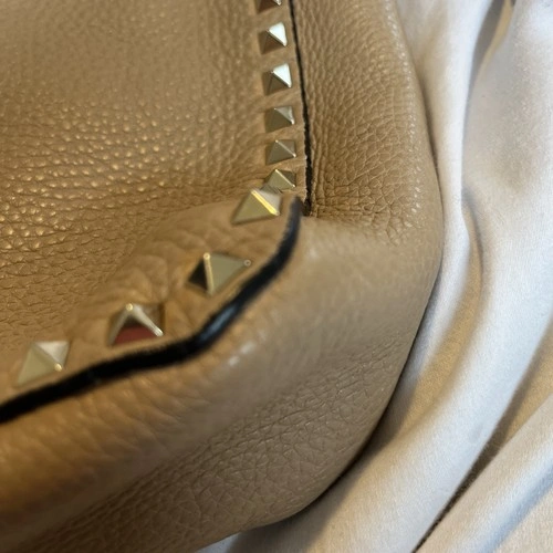 This is an authentic VALENTINO GARAVANI Pebbled Calfskin Mini Rockstud Flip-Lock Messenger Bag in nude beige color. Authentic guaranteed. Pretty good used condition. This chic messenger bag is crafted of textured calfskin leather with light brass pyramid studs lining the borders of the bag. The bag features a crossbody leather shoulder strap with light brass hardware and a light brass switch top lock that opens the bag to a suede interior with a zippered pocket.
