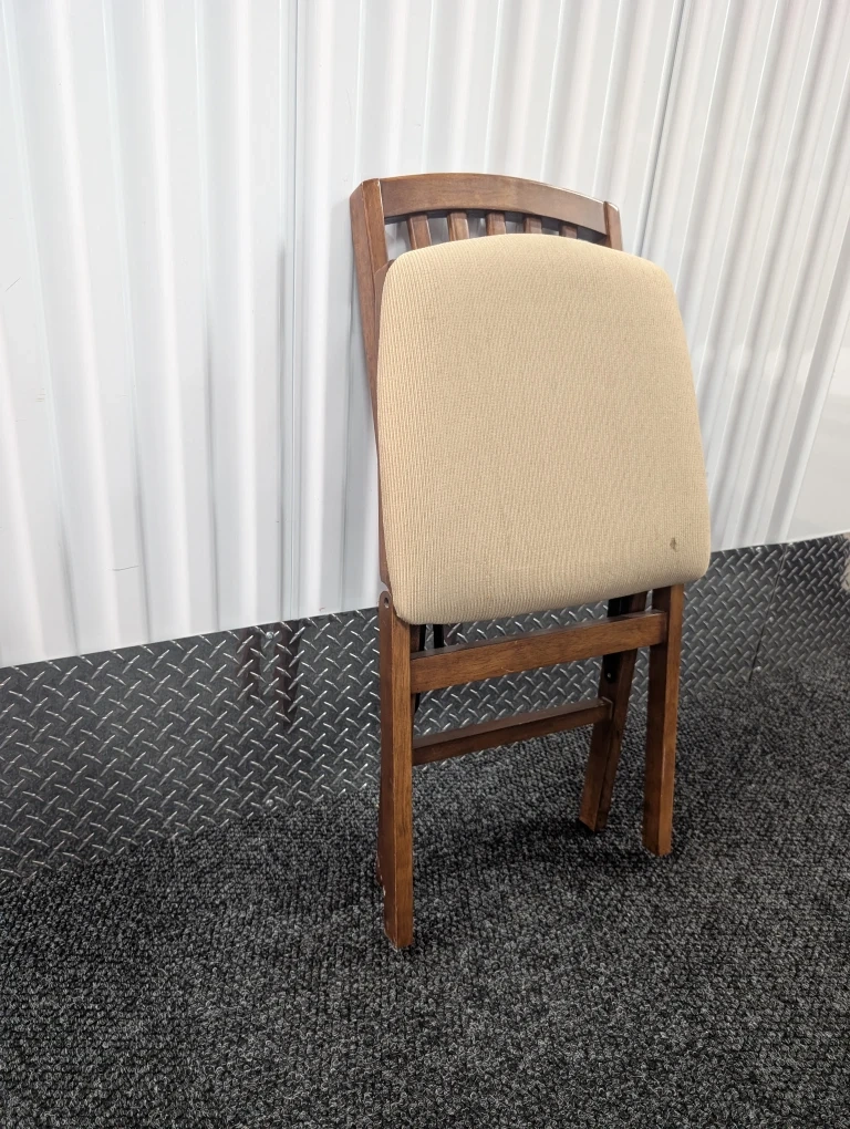 Here's a handy folding wooden chair! It's perfect when you need an extra seat that can be easily stored away when not in use. The seat is padded for extra comfort, making it great for guests or everyday use
