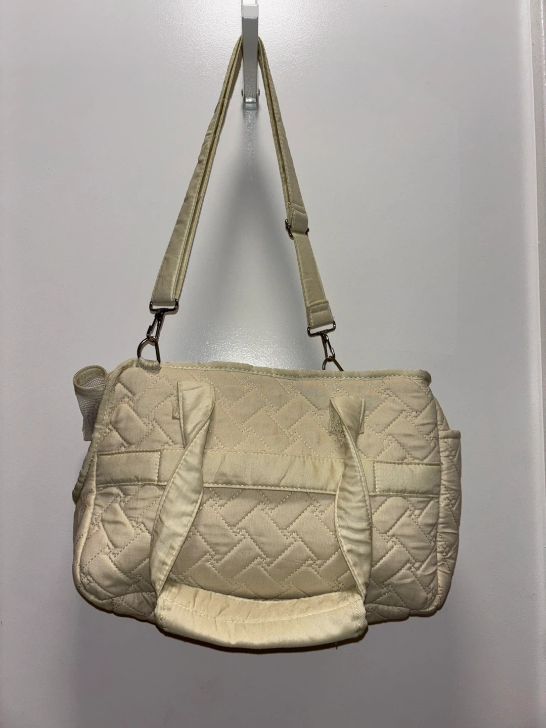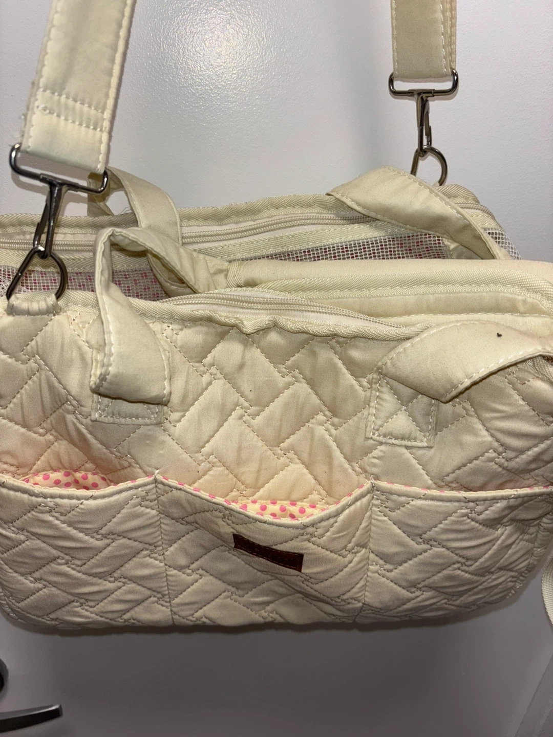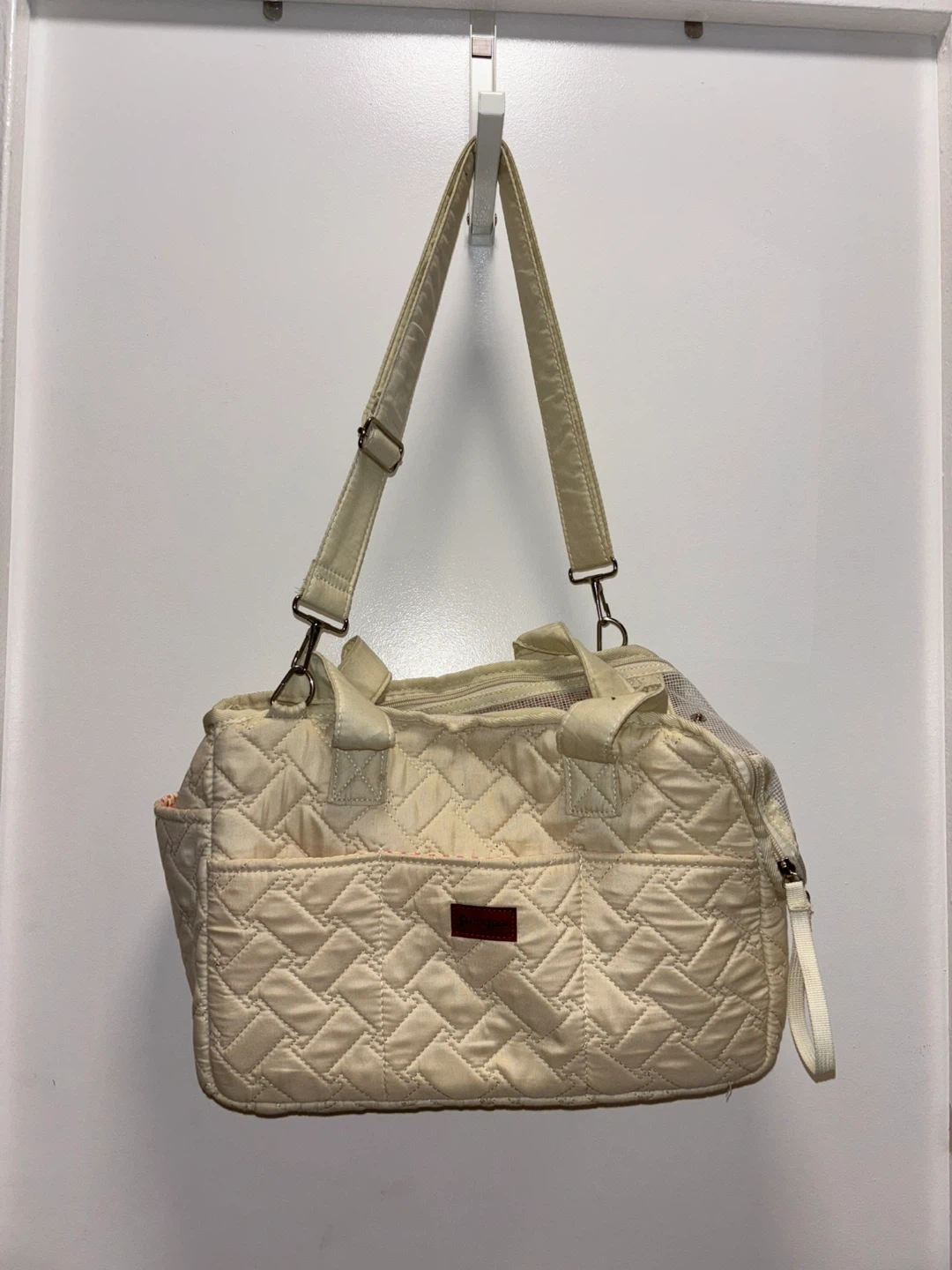 This is a quilted pattern pet carrier bag in a light cream color. It has a shoulder strap and top handles. The interior has a polka dot pattern. It has a mesh window that can be opened. Used 2 times and sadly my shorkie outgrew it. In great condition.